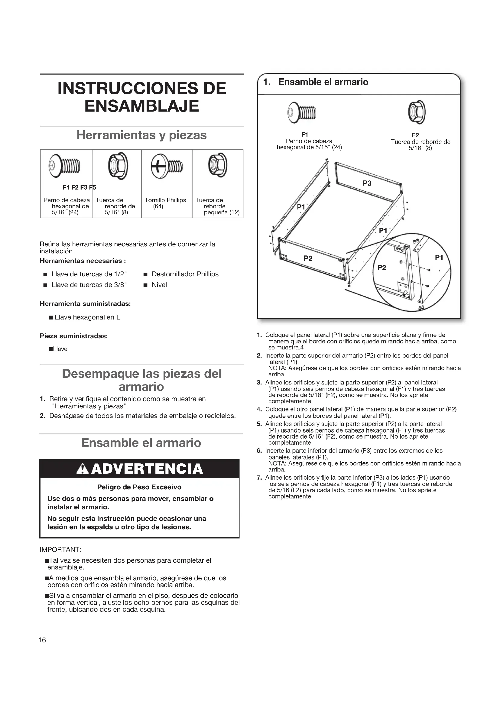 F516 INSTRUCCIONES DE ENSAMBLAJE Herramientas y piezas F1 F2 F3 F5Perno de cabeza hexagonal de 5/16" (24)Tuerca de reborde de 5/16" (8)Tornillo Phillips (64) Tuerca de reborde pequeña (12)Reúna las herramientas necesarias antes de comenzar la instalación.Herramientas necesarias : ■ Llave de tuercas de 1/2" ■ Destornillador Phillips ■ Llave de tuercas de 3/8" ■ Nivel Herramienta suministradas: ■ Llave hexagonal en LPieza suministradas: ■ Llave Desempaque las piezas del armario 1. Retire y verique el contenido como se muestra en "Herramientas y piezas".2. Deshágase de todos los materiales de embalaje o recíclelos.