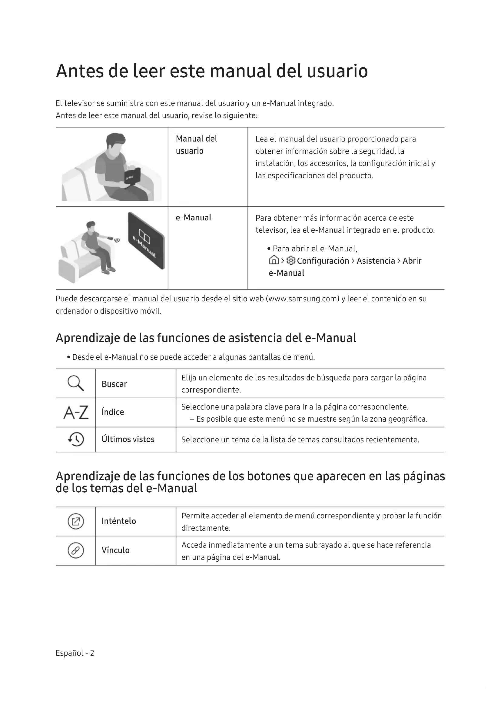 - Para abrir el e-Manual, > Configuración > Asistencia > Abrir e-Manual Puede descargarse el manual del usuario desde el sitio web (www.samsung.com) y leer el contenido en su ordenador o dispositivo móvil. Aprendizaje de las funciones de asistencia del e-Manual