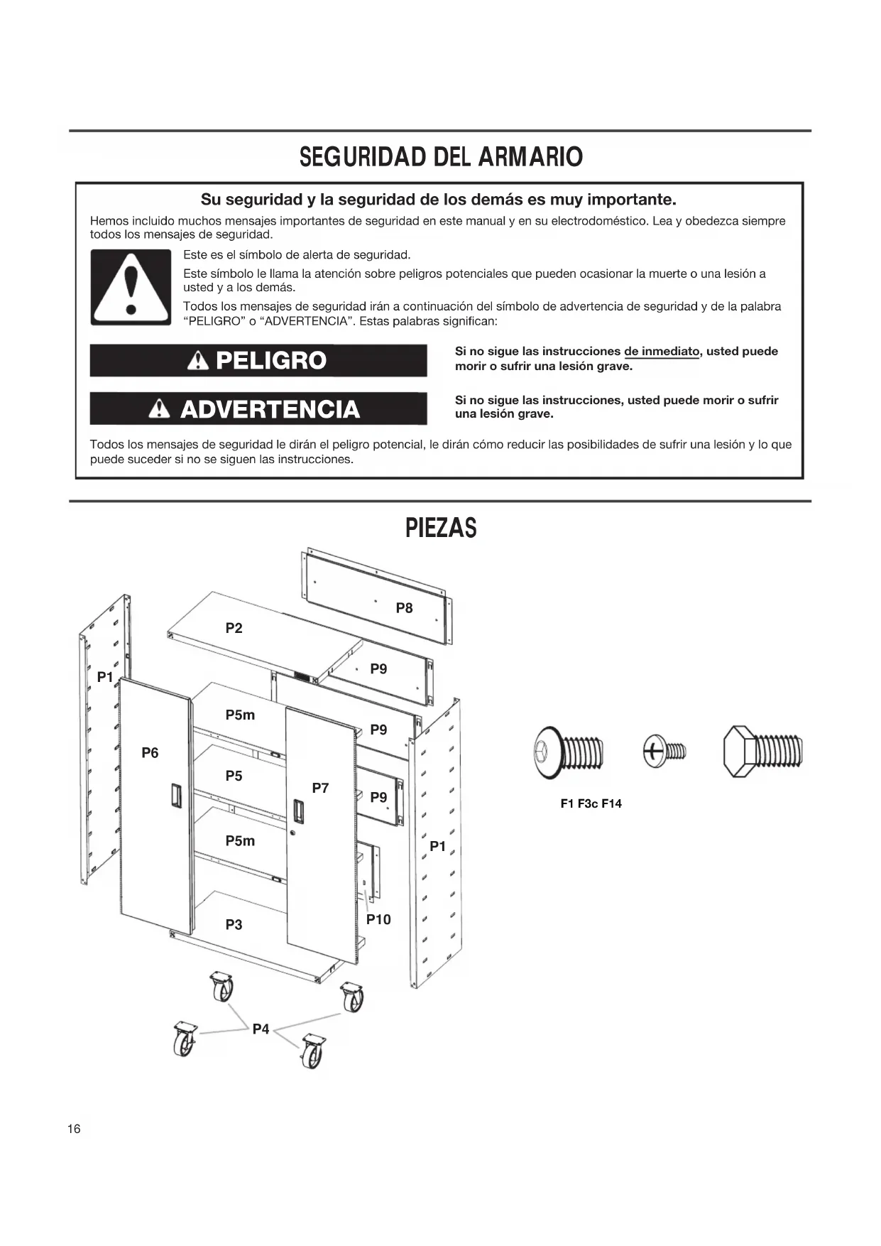 F3c F14Perno Allen de 5/16" (16)Tornillo Phillips (32) Perno de cabeza hexagonal (16)Reúna las herramientas necesarias antes de comenzar la instalación.Herramientas necesarias: ■ 1/2" Llave de tuercas de ■ Nivel ■ Destornillador PhillipsHerramienta suministradas: ■ Llave AllenPieza suministradas: ■ Llave Requisitos de uso del armario ■ Diseñado para usarse en un garage. ■ El límite de peso máximo es de 50 lbs (22,7 kg) para cada estante. ■ El límite de peso máximo es de 300 lbs (136 kg) para el armario. Desempaque las piezas del armario 1. Quite y verique el contenido. Se incluye una llave Allen, una llave y las piezas y sujetadores que se muestran en “Piezas”.2. Deshágase de todos los materiales de embalaje o recíclelos. Ensamble el armario IMPORTANTE: Tal vez se necesiten dos personas para completar el ensamble. A medida que ensambla el armario, asegúrese de que los bordes con oricios estén mirando hacia arriba. La parte superior del armario (P2) se ha diseñado de manera que las lengüetas sólo coincidirán con las placas de enganche, ubicadas en los lados, cuando éste se coloque correctamente. Si las lengüetas en la parte superior del armario no encajan en las placas de enganche, ubicadas en el panel lateral (P1), dé vuelta a la parte superior del armario. ADVERTENCIA Peligro de Peso ExcesivoUse dos o más personas para mover, ensamblar o instalar el armario.No seguir esta instrucción puede ocasionar una lesión en la espalda u otro tipo de lesiones. 1a. Ensamble el armario Coloque el panel lateral (P1) sobre una supercie plana y rme de manera que el extremo con las placas de enganche quede mirando hacia arriba. Alinee las lengüetas en la parte superior del amario (P2) con las placas de enganche en el lado del armario (P1). Deslice la parte superior del armario entre los extremos del panel lateral. NOTA: Asegúrese de que cada lengüeta esté insertada por completo detrás de la placa de enganche. Alinee los dos oricios en cada esquina. Usando pernos con cabeza Allen (F1), sujete el panel lateral (P1) a la parte superior (P2), como se muestra. No los apriete completamente. Repita los pasos 2 y 3 para el otro lado del armario (P1). Con el lado liso mirando hacia el interior del armario, alinee las 4 lengüetas en la parte inferior del armario (P3) con las placas de enganche en los lados del armario (P1). Deslice la parte inferior del armario entre los extremos de los paneles laterales. NOTA: Asegúrese de que cada lengüeta esté insertada por completo detrás de la placa de enganche. Alinee los dos oricios en cada esquina. Usando pernos con cabeza Allen (F1), sujete los paneles laterales (P1) a la parte inferior (P3), como se muestra. No los apriete completamente.