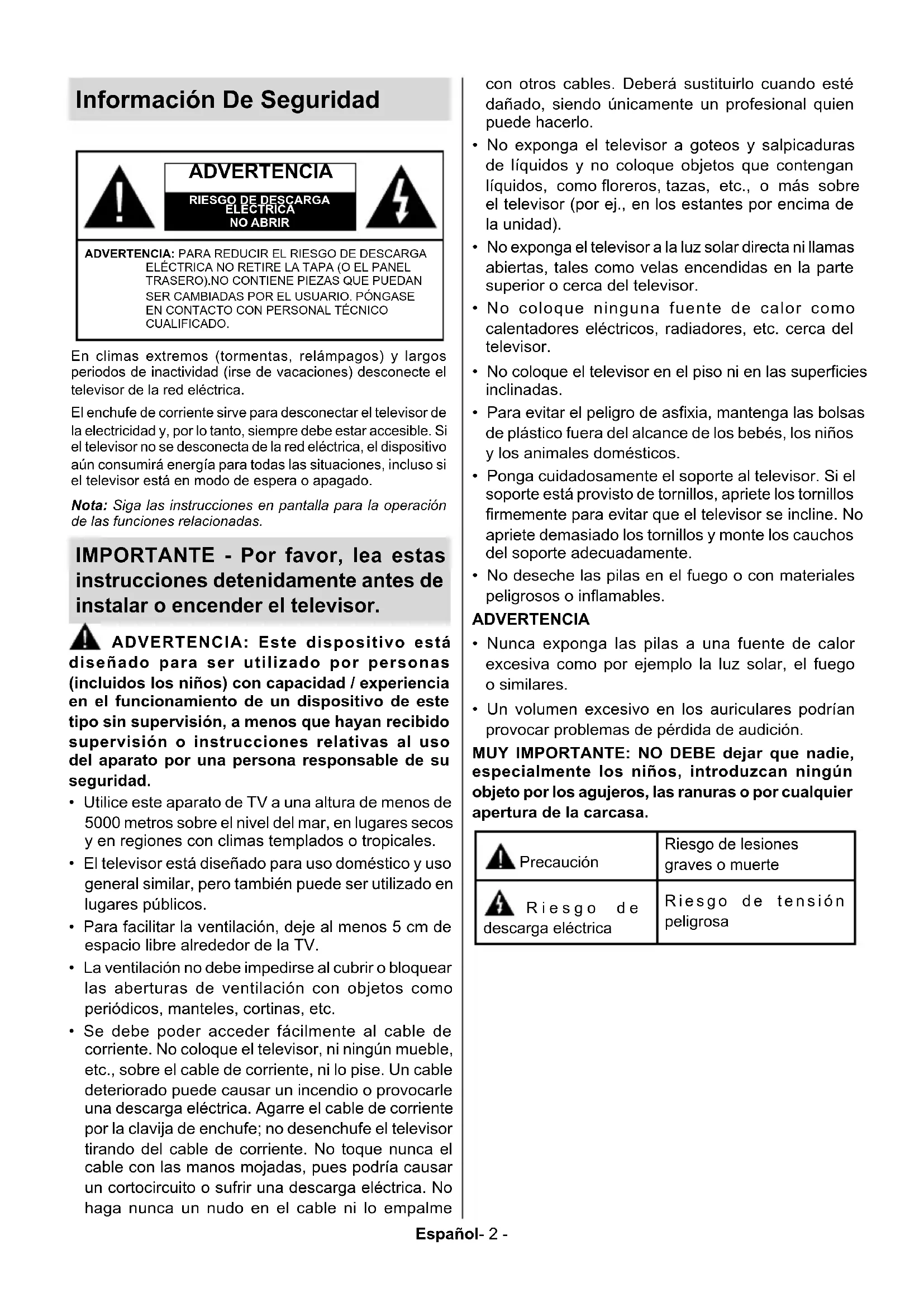 Información sobre su desecho ............................ 35Español- 2 - Información De Seguridad ADVERTENCIA RIESGO DE DESCARGA ELÉCTRICANO ABRIRADVERTENCIA: PARA REDUCIR EL RIESGO DE DESCARGA ELÉCTRICA NO RETIRE LA TAPA (O EL PANEL TRASERO).NO CONTIENE PIEZAS QUE PUEDAN SER CAMBIADAS POR EL USUARIO. PÓNGASE EN CONTACTO CON PERSONAL TÉCNICO CUALIFICADO.Nota: Siga las instrucciones en pantalla para la operación de las funciones relacionadas.En climas extremos (tormentas, relámpagos) y largos periodos de inactividad (irse de vacaciones) desconecte el televisor de la red eléctrica.El enchufe de corriente sirve para desconectar el televisor de la electricidad y, por lo tanto, siempre debe estar accesible. Si el televisor no se desconecta de la red eléctrica, el dispositivo aún consumirá energía para todas las situaciones, incluso si el televisor está en modo de espera o apagado. IMPORTANTE - Por favor, lea estas instrucciones detenidamente antes de instalar o encender el televisor. ADVERTENCIA: Este dispositivo está diseñado para ser utilizado por personas (incluidos los niños) con capacidad / experiencia en el funcionamiento de un dispositivo de este tipo sin supervisión, a menos que hayan recibido supervisión o instrucciones relativas al uso del aparato por una persona responsable de su seguridad.