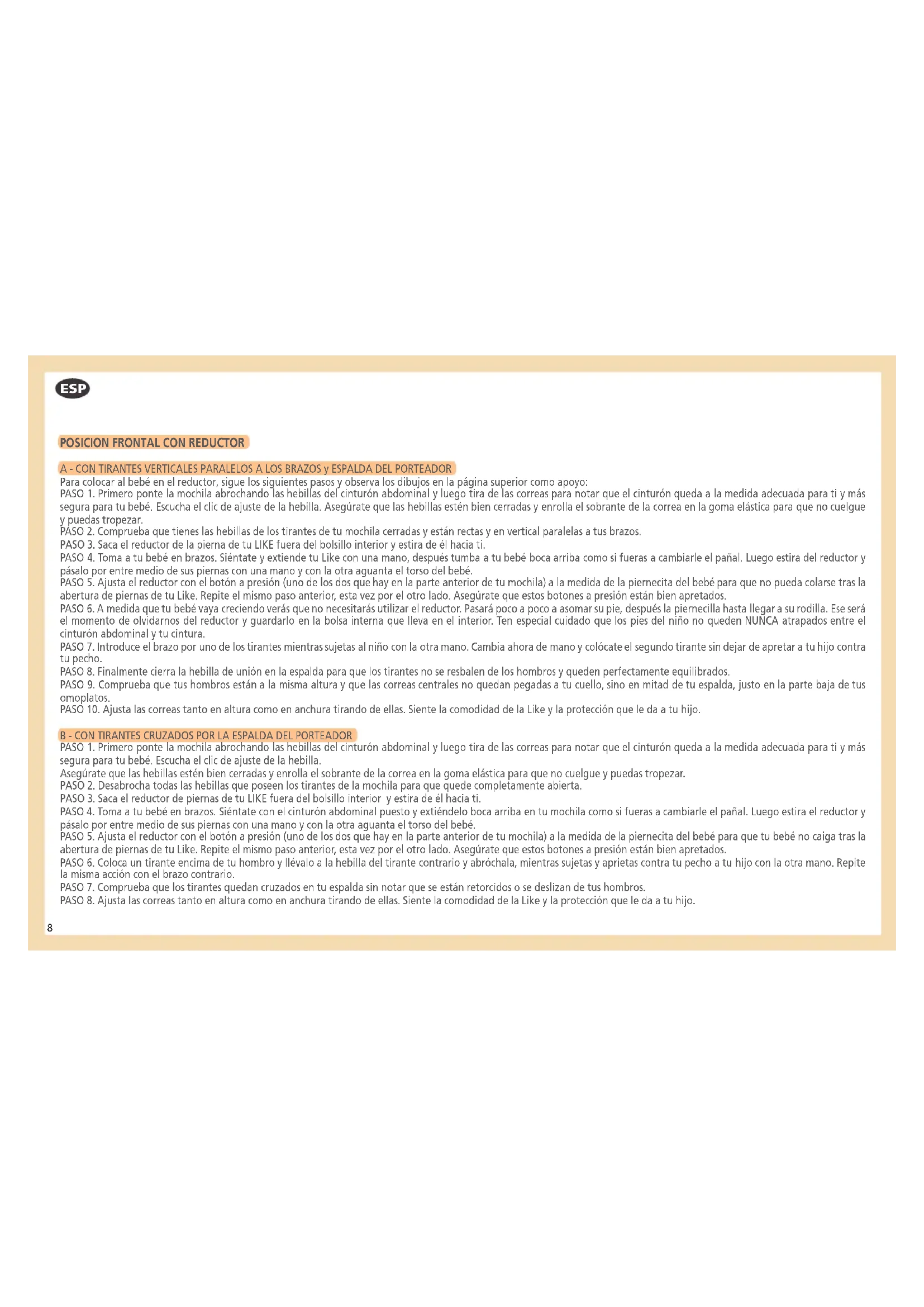 A - CON TIRANTES VERTICALES PARALELOS A LOS BRAZOS y ESPALDA DEL PORTEADOR Para colocar al bebé en el reductor, sigue los siguientes pasos y observa los dibujos en la página superior como apoyo: PASO 1. Primero ponte la mochila abrochando las hebillas del cinturón abdominal y luego tira de las correas para notar que el cinturón queda a la medida adecuada para ti y más segura para tu bebé. Escucha el clic de ajuste de la hebilla. Asegúrate que las hebillas estén bien cerradas y enrolla el sobrante de la correa en la goma elástica para que no cuelgue y puedas tropezar. PASO 2. Comprueba que tienes las hebillas de los tirantes de tu mochila cerradas y están rectas y en vertical paralelas a tus brazos. PASO 3. Saca el reductor de la pierna de tu LIKE fuera del bolsillo interior y estira de él hacia ti. PASO 4. Toma a tu bebé en brazos. Siéntate y extiende tu Like con una mano, después tumba a tu bebé boca arriba como si fueras a cambiarle el pañal. Luego estira del reductor y pásalo por entre medio de sus piernas con una mano y con la otra aguanta el torso del bebé. PASO 5. Ajusta el reductor con el botón a presión (uno de los dos que hay en la parte anterior de tu mochila) a la medida de la piernecita del bebé para que no pueda colarse tras la abertura de piernas de tu Like. Repite el mismo paso anterior, esta vez por el otro lado. Asegúrate que estos botones a presión están bien apretados. PASO 6. A medida que tu bebé vaya creciendo verás que no necesitarás utilizar el reductor. Pasará poco a poco a asomar su pie, después la piernecilla hasta llegar a su rodilla. Ese será el momento de olvidarnos del reductor y guardarlo en la bolsa interna que lleva en el interior. Ten especial cuidado que los pies del niño no queden NUNCA atrapados entre el cinturón abdominal y tu cintura. PASO 7. Introduce el brazo por uno de los tirantes mientras sujetas al niño con la otra mano. Cambia ahora de mano y colócate el segundo tirante sin dejar de apretar a tu hijo contra tu pecho. PASO 8. Finalmente cierra la hebilla de unión en la espalda para que los tirantes no se resbalen de los hombros y queden perfectamente equilibrados. PASO 9. Comprueba que tus hombros están a la misma altura y que las correas centrales no quedan pegadas a tu cuello, sino en mitad de tu espalda, justo en la parte baja de tus omoplatos. PASO 10. Ajusta las correas tanto en altura como en anchura tirando de ellas. Siente la comodidad de la Like y la protección que le da a tu hijo. B - CON TIRANTES CRUZADOS POR LA ESPALDA DEL PORTEADOR PASO 1. Primero ponte la mochila abrochando las hebillas del cinturón abdominal y luego tira de las correas para notar que el cinturón queda a la medida adecuada para ti y más segura para tu bebé. Escucha el clic de ajuste de la hebilla. Asegúrate que las hebillas estén bien cerradas y enrolla el sobrante de la correa en la goma elástica para que no cuelgue y puedas tropezar. PASO 2. Desabrocha todas las hebillas que poseen los tirantes de la mochila para que quede completamente abierta. PASO 3. Saca el reductor de piernas de tu LIKE fuera del bolsillo interior y estira de él hacia ti. PASO 4. Toma a tu bebé en brazos. Siéntate con el cinturón abdominal puesto y extiéndelo boca arriba en tu mochila como si fueras a cambiarle el pañal. Luego estira el reductor y pásalo por entre medio de sus piernas con una mano y con la otra aguanta el torso del bebé. PASO 5. Ajusta el reductor con el botón a presión (uno de los dos que hay en la parte anterior de tu mochila) a la medida de la piernecita del bebé para que tu bebé no caiga tras la abertura de piernas de tu Like. Repite el mismo paso anterior, esta vez por el otro lado. Asegúrate que estos botones a presión están bien apretados. PASO 6. Coloca un tirante encima de tu hombro y llévalo a la hebilla del tirante contrario y abróchala, mientras sujetas y aprietas contra tu pecho a tu hijo con la otra mano. Repite la misma acción con el brazo contrario. PASO 7. Comprueba que los tirantes quedan cruzados en tu espalda sin notar que se están retorcidos o se deslizan de tus hombros. PASO 8. Ajusta las correas tanto en altura como en anchura tirando de ellas. Siente la comodidad de la Like y la protección que le da a tu hijo. ESP9 ESP