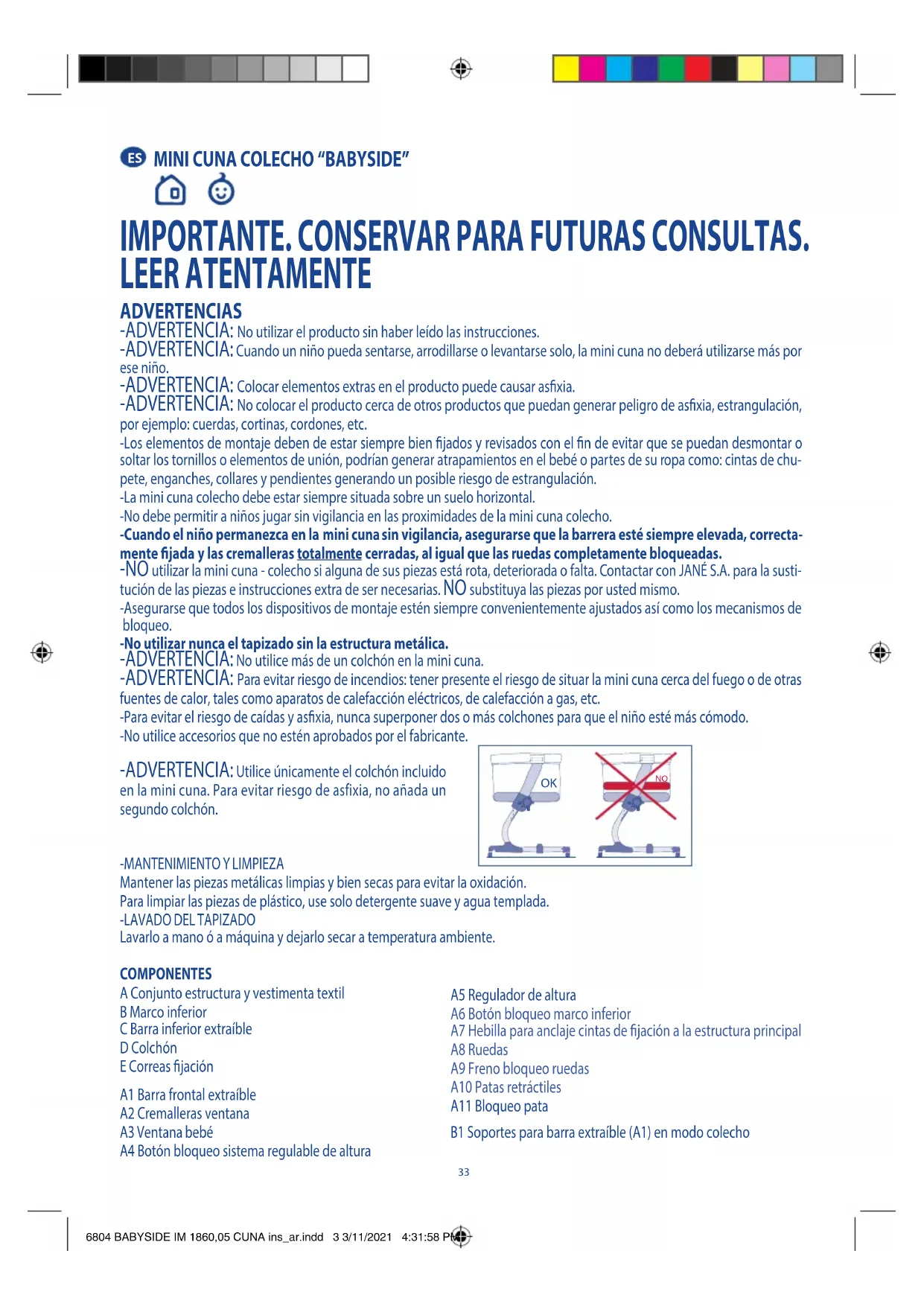 IMPORTANTE. CONSERVAR PARA FUTURAS CONSULTAS. LEER ATENTAMENTE ADVERTENCIAS -ADVERTENCIA: No utilizar el producto sin haber leído las instrucciones. -ADVERTENCIA: Cuando un niño pueda sentarse, arrodillarse o levantarse solo, la mini cuna no deberá utilizarse más por ese niño. -ADVERTENCIA: Colocar elementos extras en el producto puede causar asxia. -ADVERTENCIA: No colocar el producto cerca de otros productos que puedan generar peligro de asxia, estrangulación, por ejemplo: cuerdas, cortinas, cordones, etc. -Los elementos de montaje deben de estar siempre bien jados y revisados con el n de evitar que se puedan desmontar o soltar los tornillos o elementos de unión, podrían generar atrapamientos en el bebé o partes de su ropa como: cintas de chu- pete, enganches, collares y pendientes generando un posible riesgo de estrangulación. -La mini cuna colecho debe estar siempre situada sobre un suelo horizontal. -No debe permitir a niños jugar sin vigilancia en las proximidades de la mini cuna colecho. -Cuando el niño permanezca en la mini cuna sin vigilancia, asegurarse que la barrera esté siempre elevada, correcta- mente jada y las cremalleras totalmente cerradas, al igual que las ruedas completamente bloqueadas. -NO utilizar la mini cuna - colecho si alguna de sus piezas está rota, deteriorada o falta. Contactar con JANÉ S.A. para la susti- tución de las piezas e instrucciones extra de ser necesarias. NO substituya las piezas por usted mismo. -Asegurarse que todos los dispositivos de montaje estén siempre convenientemente ajustados así como los mecanismos de bloqueo. -No utilizar nunca el tapizado sin la estructura metálica. -ADVERTENCIA: No utilice más de un colchón en la mini cuna. -ADVERTENCIA: Para evitar riesgo de incendios: tener presente el riesgo de situar la mini cuna cerca del fuego o de otras fuentes de calor, tales como aparatos de calefacción eléctricos, de calefacción a gas, etc. -Para evitar el riesgo de caídas y asxia, nunca superponer dos o más colchones para que el niño esté más cómodo. -No utilice accesorios que no estén aprobados por el fabricante. -ADVERTENCIA: Utilice únicamente el colchón incluido en la mini cuna. Para evitar riesgo de asfixia, no añada un segundo colchón.