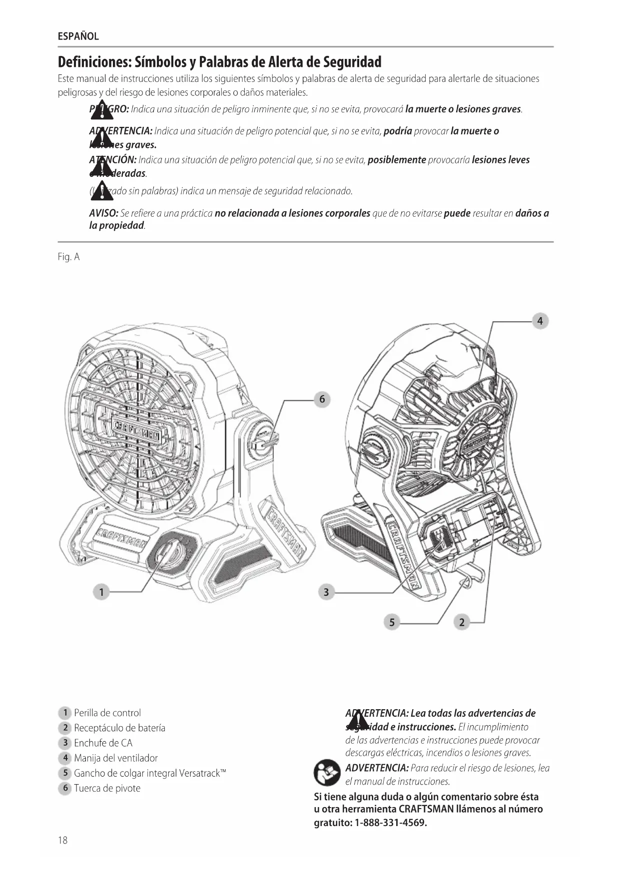 ADVERTENCIA: Lea todas las advertencias de seguridad e instrucciones. El incumplimiento de las advertencias e instrucciones puede provocar descargas eléctricas, incendios o lesionesgraves. ADVERTENCIA: Para reducir el riesgo de lesiones, lea el manual deinstrucciones. Si tiene alguna duda o algún comentario sobre ésta u otra herramienta CRAFTSMAN llámenos al número gratuito: 1-888-331-4569.