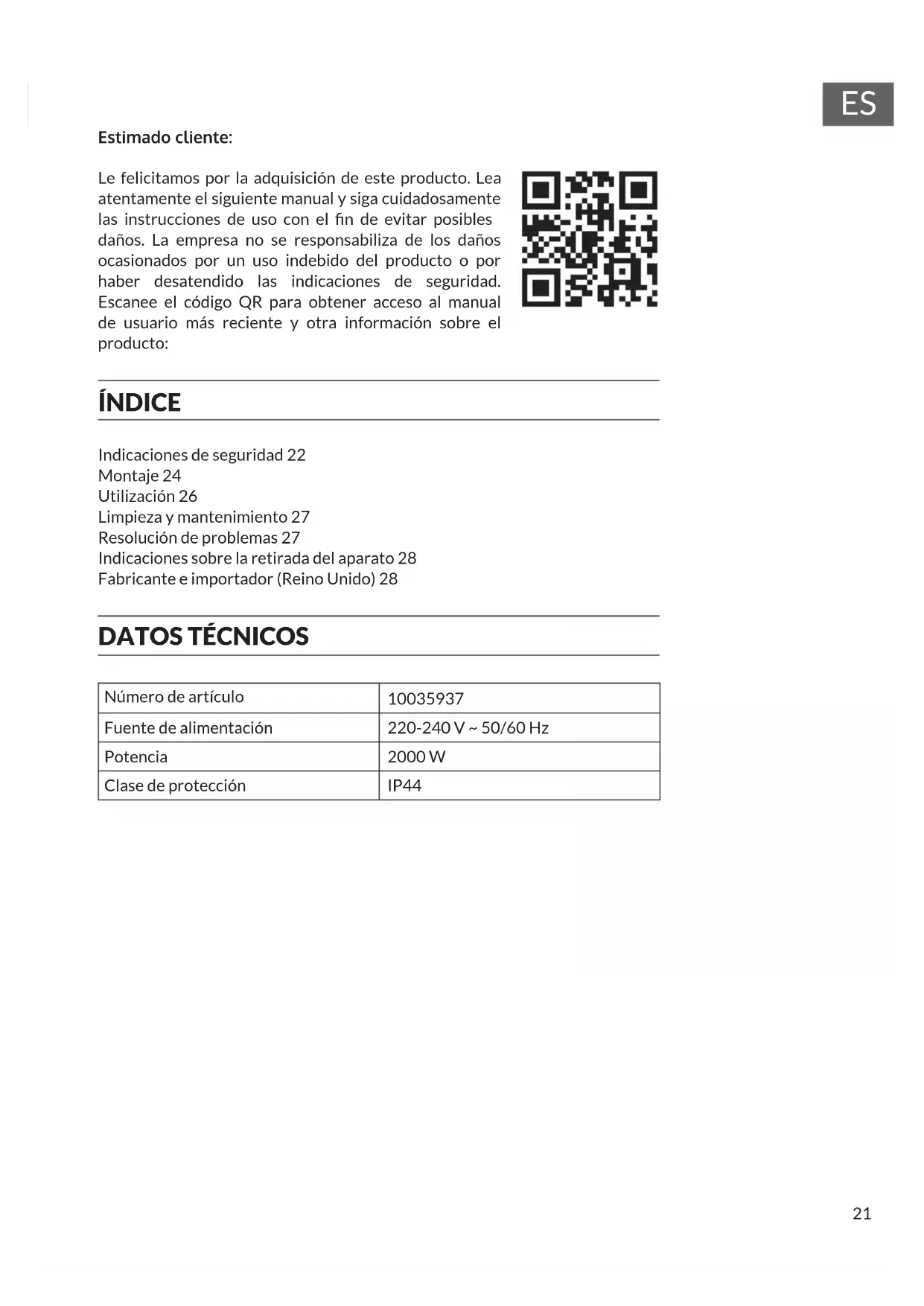 Estimado cliente: Le felicitamos por la adquisición de este producto. Lea atentamente el siguiente manual y siga cuidadosamente las instrucciones de uso con el n de evitar posibles daños. La empresa no se responsabiliza de los daños ocasionados por un uso indebido del producto o por haber desatendido las indicaciones de seguridad. Escanee el código QR para obtener acceso al manual de usuario más reciente y otra información sobre el producto: ÍNDICE Indicaciones de seguridad 22 Montaje 24 Utilización 26 Limpieza y mantenimiento 27 Resolución de problemas 27 Indicaciones sobre la retirada del aparato 28 Fabricante e importador (Reino Unido) 28