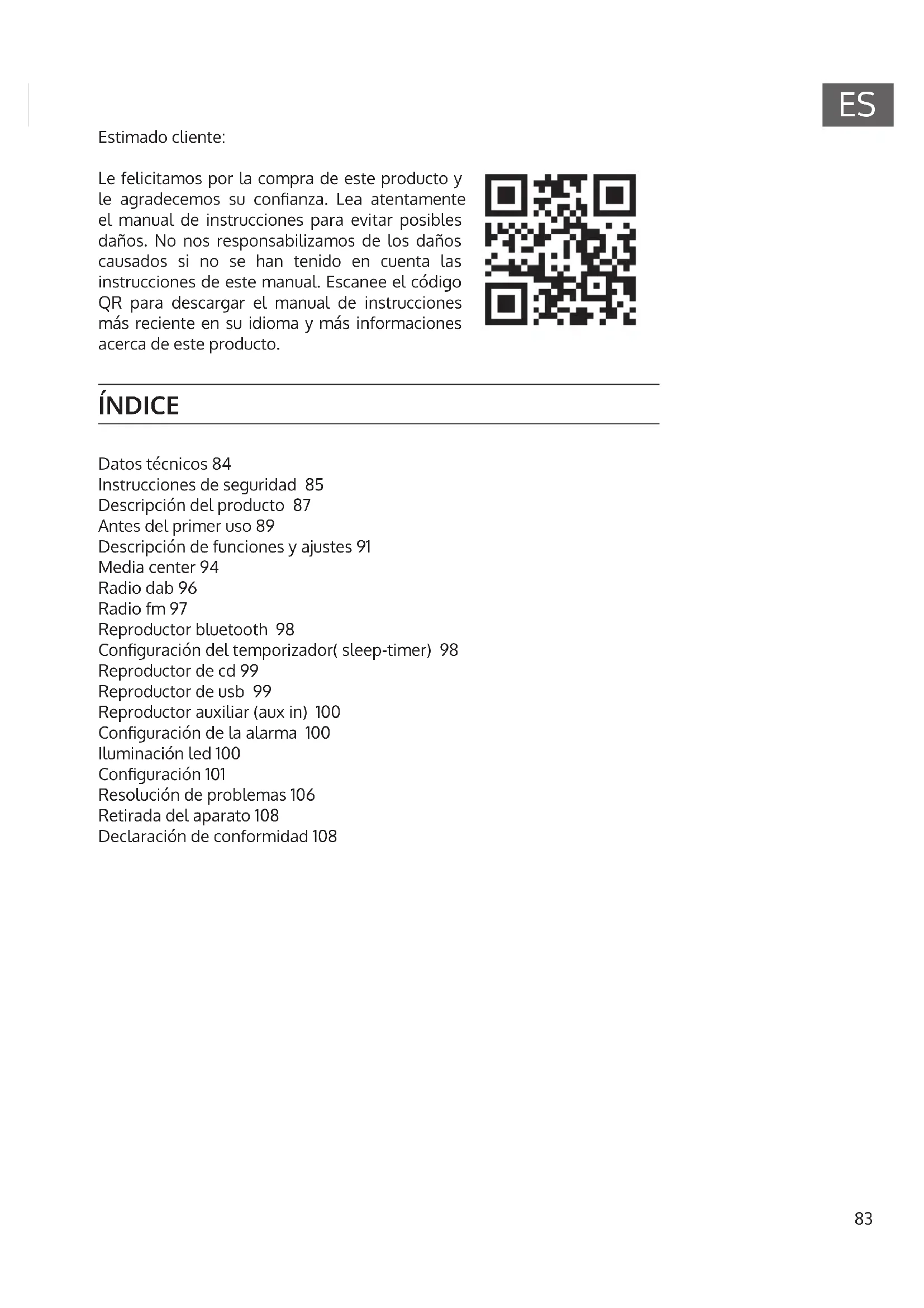 Datos técnicos 84 Instrucciones de seguridad 85 Descripción del producto 87 Antes del primer uso 89 Descripción de funciones y ajustes 91 Media center 94 Radio dab 96 Radio fm 97 Reproductor bluetooth 98 Conguración del temporizador( sleep-timer) 98 Reproductor de cd 99 Reproductor de usb 99 Reproductor auxiliar (aux in) 100 Conguración de la alarma 100 Iluminación led 100 Conguración 101 Resolución de problemas 106 Retirada del aparato 108 Declaración de conformidad 108 ÍNDICE Estimado cliente: Le felicitamos por la compra de este producto y le agradecemos su conanza. Lea atentamente el manual de instrucciones para evitar posibles daños. No nos responsabilizamos de los daños causados si no se han tenido en cuenta las instrucciones de este manual. Escanee el código QR para descargar el manual de instrucciones más reciente en su idioma y más informaciones acerca de este producto.84