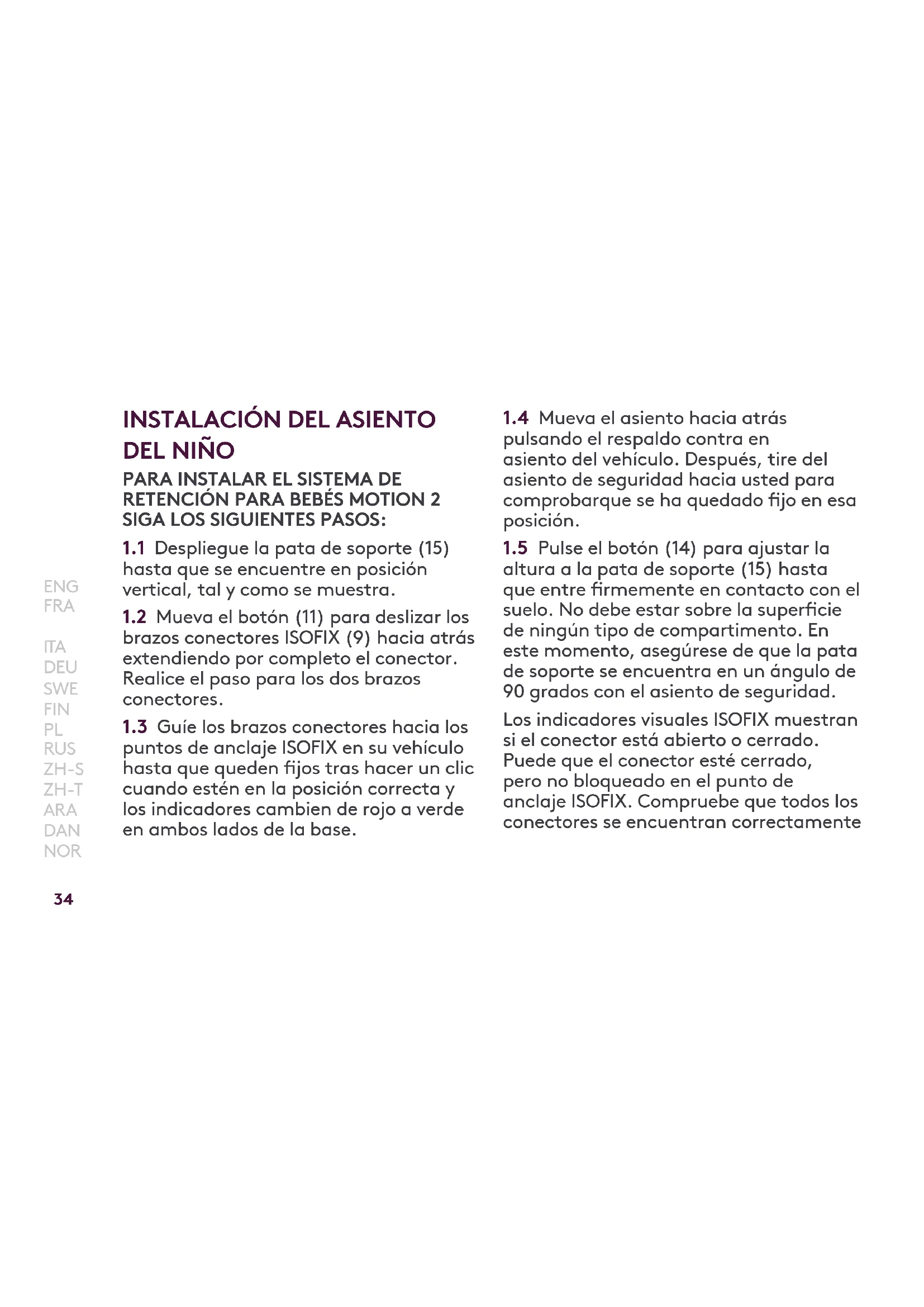 altura a la pata de soporte (15) hasta que entre rmemente en contacto con el suelo. No debe estar sobre la supercie de ningún tipo de compartimento. En este momento, asegúrese de que la pata de soporte se encuentra en un ángulo de 90 grados con el asiento de seguridad. Los indicadores visuales ISOFIX muestran si el conector está abierto o cerrado. Puede que el conector esté cerrado, pero no bloqueado en el punto de anclaje ISOFIX. Compruebe que todos los conectores se encuentran correctamente Motion 2 All Size 360ºsilvercrossbaby.com bloqueados en los puntos de anclaje del vehículo tirando del asiento una vez que se haya instalado