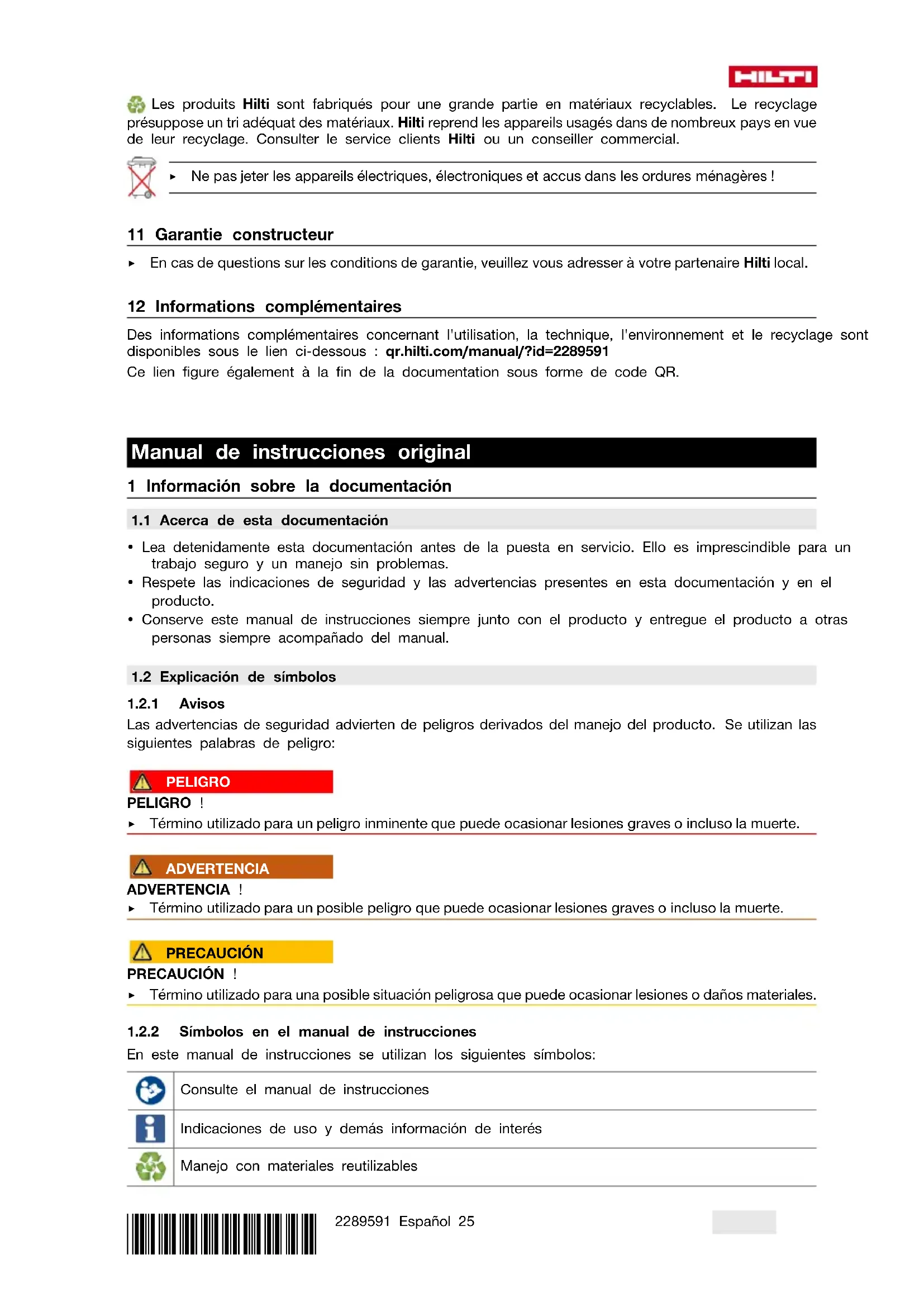 En este manual de instrucciones se utilizan los siguientes símbolos: Consulte el manual de instrucciones Indicaciones de uso y demás información de interés Manejo con materiales reutilizables26 Español 2289591 *2289591* No tire las herramientas eléctricas y las baterías junto con los desperdicios domésticos Hilti Batería de Ion-Litio Hilti Cargador