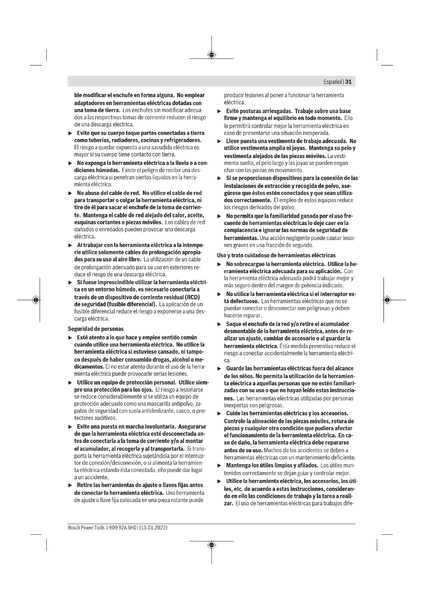 Low Energy Module contém uma pilha botão. Se a pilha botão estiver muito fraca ou descarregada, será alertado pela Bosch Toolbox. A substituição da pilha botão tem de ser feita pela Bosch ou um posto de assistência técnica autorizado para ferramentas elétricas Bosch. u Atenção: substitua sempre uma pilha botão por uma pilha botão do mesmo tipo. Há risco de explosão. u Elimine as pilhas botão descarregadas de forma correta. As pilhas botão podem perder a estanqueidade e, consequentemente, danificar o produto ou ferir pessoas. Serviço pós-venda e aconselhamento O serviço pós-venda responde às suas perguntas a respeito de serviços de reparação e de manutenção do seu produto, assim como das peças sobressalentes. Desenhos explodidos e informações acerca das peças sobressalentes também em: www.bosch-pt.com A nossa equipa de consultores Bosch esclarece com prazer todas as suas dúvidas a respeito dos nossos produtos e acessórios. Indique para todas as questões e encomendas de peças sobressalentes a referência de 10 dígitos de acordo com a placa de caraterísticas do produto. Brasil Robert Bosch Ltda. – Divisão de Ferramentas Elétricas Rodovia Anhanguera, Km 98 - Parque Via Norte 13065-900, CP 1195 Campinas, São Paulo Tel.: 0800 7045 446 www.bosch.com.br/contato Encontra outros endereços da assistência técnica em: www.bosch-pt.com/serviceaddresses Transporte As baterias de iões de lítio recomendadas estão sujeitas ao direito de materiais perigosos. As baterias podem ser transportadas na rua pelo utilizador, sem mais obrigações. Na expedição por terceiros (porex: transporte aéreo ou expedição), devem ser observadas as especiais exigências quanto à embalagem e à designação. Neste caso é necessário consultar um especialista de materiais perigosos ao preparar a peça a ser trabalhada. Só enviar baterias se a carcaça não estiver danificada. Colar contactos abertos e embalar a bateria de modo que não possa se movimentar dentro da embalagem. Por favor observe também eventuais diretivas nacionais suplementares. Eliminação As ferramentas elétricas, as baterias, os acessórios e as embalagens devem ser enviados a uma reciclagem ecológica de matéria prima. Não deitar ferramentas elétricas e baterias/ pilhas no lixo doméstico! Baterias/pilhas: Lítio: Observar as indicações no capítulo Transporte (ver "Transporte", Página30). Español Indicaciones de seguridad Indicaciones generales de seguridad para herramientas eléctricas ADVERTEN- CIA Lea íntegramente las advertencias de peligro, las instrucciones, las ilustraciones y las especificacio- nes entregadas con esta herramienta eléctrica. En caso de no atenerse a las instrucciones siguientes, ello puede ocasionar una descarga eléctrica, un incendio y/o una lesión grave. Guardar todas las advertencias de peligro e instruccio- nes para futuras consultas. El término "herramienta eléctrica" empleado en las siguien- tes advertencias de peligro se refiere a herramientas eléctri- cas de conexión a la red (con cable de red) y a herramientas eléctricas accionadas por acumulador (sin cable de red). Seguridad del puesto de trabajo u Mantenga el área de trabajo limpia y bien iluminada. Las áreas desordenadas u oscuras pueden provocar acci- dentes. u No utilice herramientas eléctricas en un entorno con peligro de explosión, en el que se encuentren combus- tibles líquidos, gases o material en polvo. Las herra- mientas eléctricas producen chispas que pueden llegar a inflamar los materiales en polvo o vapores. u Mantenga alejados a los niños y otras personas de su puesto de trabajo al emplear la herramienta eléctrica. Una distracción le puede hacer perder el control sobre la herramienta eléctrica. Seguridad eléctrica u El enchufe de la herramienta eléctrica debe corres- ponder a la toma de corriente utilizada. No es admisi- 1 609 92A 6HD | (13.01.2022) Bosch Power ToolsEspañol | 31 ble modificar el enchufe en forma alguna. No emplear adaptadores en herramientas eléctricas dotadas con una toma de tierra. Los enchufes sin modificar adecua- dos a las respectivas tomas de corriente reducen el riesgo de una descarga eléctrica. u Evite que su cuerpo toque partes conectadas a tierra como tuberías, radiadores, cocinas y refrigeradores. El riesgo a quedar expuesto a una sacudida eléctrica es mayor si su cuerpo tiene contacto con tierra. u No exponga la herramienta eléctrica a la lluvia o a con- diciones húmedas. Existe el peligro de recibir una des- carga eléctrica si penetran ciertos líquidos en la herra- mienta eléctrica. u No abuse del cable de red. No utilice el cable de red para transportar o colgar la herramienta eléctrica, ni tire de él para sacar el enchufe de la toma de corrien- te. Mantenga el cable de red alejado del calor, aceite, esquinas cortantes o piezas móviles. Los cables de red dañados o enredados pueden provocar una descarga eléctrica. u Al trabajar con la herramienta eléctrica a la intempe- rie utilice solamente cables de prolongación apropia- dos para su uso al aire libre. La utilización de un cable de prolongación adecuado para su uso en exteriores re- duce el riesgo de una descarga eléctrica. u Si fuese imprescindible utilizar la herramienta eléctri- ca en un entorno húmedo, es necesario conectarla a través de un dispositivo de corriente residual (RCD) de seguridad (fusible diferencial). La aplicación de un fusible diferencial reduce el riesgo a exponerse a una des- carga eléctrica. Seguridad de personas u Esté atento a lo que hace y emplee sentido común cuando utilice una herramienta eléctrica. No utilice la herramienta eléctrica si estuviese cansado, ni tampo- co después de haber consumido drogas, alcohol o me- dicamentos. El no estar atento durante el uso de la herra- mienta eléctrica puede provocarle serias lesiones. u Utilice un equipo de protección personal. Utilice siem- pre una protección para los ojos. El riesgo a lesio