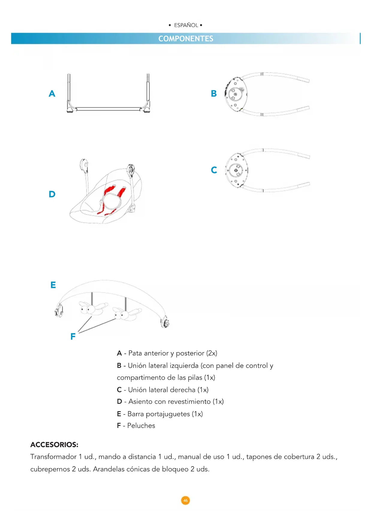 - ESPAÑOL • • ESPAÑOL • COMPONENTES A - Pata anterior y posterior (2x) B - Unión lateral izquierda (con panel de control y compartimento de las pilas (1x) C - Unión lateral derecha (1x) D - Asiento con revestimiento (1x) E - Barra portajuguetes (1x) F - Peluches ACCESORIOS: Transformador 1 ud., mando a distancia 1 ud., manual de uso 1 ud., tapones de cobertura 2 uds., cubrepernos 2 uds. Arandelas cónicas de bloqueo 2 uds.
