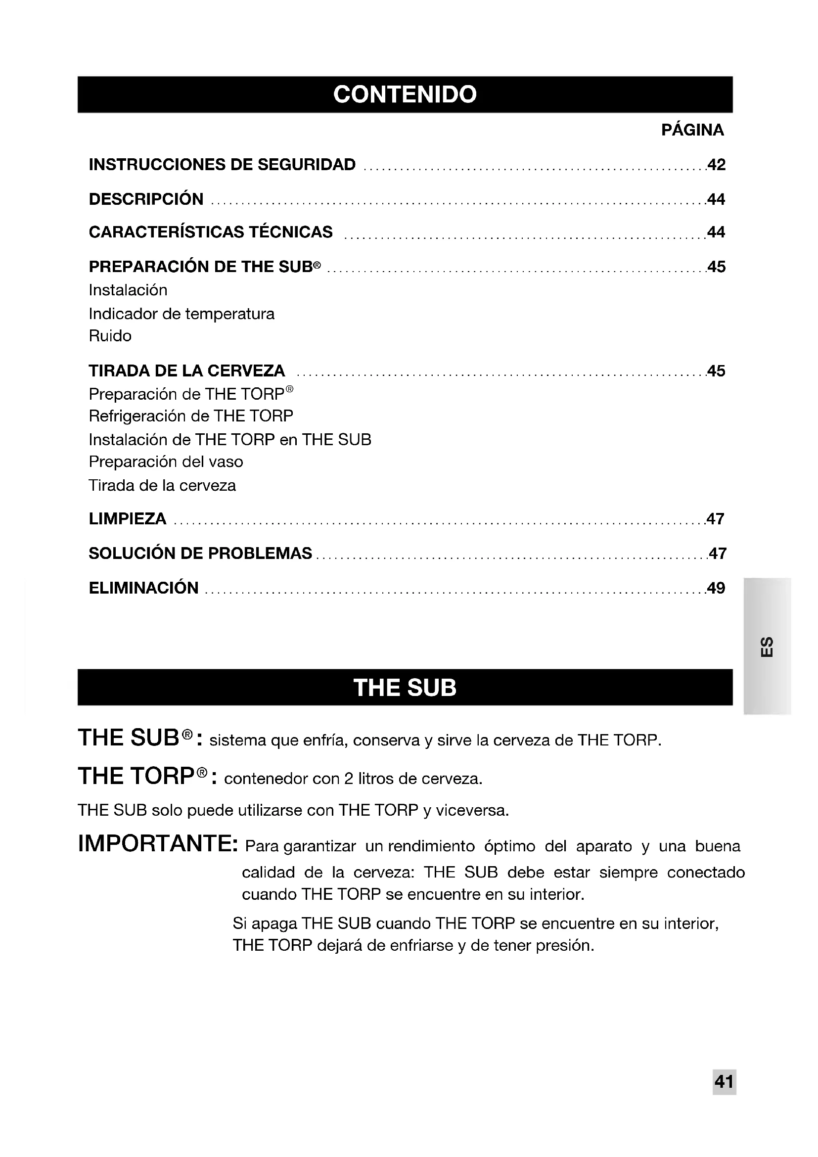 : contenedor con 2 litros de cerveza. THE SUB solo puede utilizarse con THE TORP y viceversa. IMPORTANTE: Para garantizar un rendimiento óptimo del aparato y una buena calidad de la cerveza: THE SUB debe estar siempre conectado cuando THE TORP se encuentre en su interior. Si apaga THE SUB cuando THE TORP se encuentre en su interior, THE TORP dejará de enfriarse y de tener presión. CONTENIDO THE SUB KR_MACHINE A BIERE_THE SUB_NC00120880_NC00120880 27/08/13 10:35 Page41• La utilización de este aparato no está indicada para personas (niños incluidos) con capacidades físicas, sensoriales o mentales reducidas, o sin la experiencia y los conocimientos necesarios, a menos que se encuentren bajo supervisión o hayan recibido instrucciones sobre la utilización del aparato por parte de la persona responsable de su seguridad.