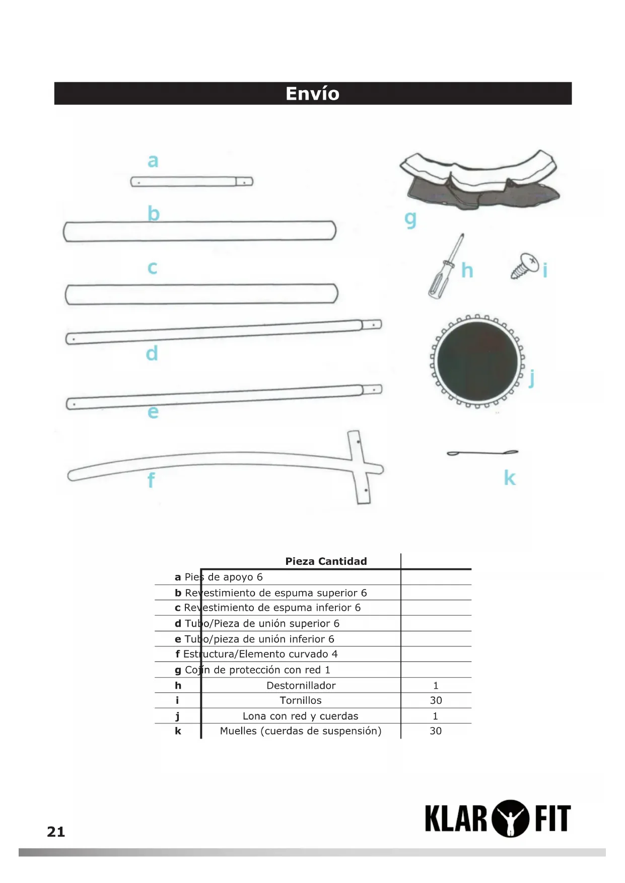 - Antes de cada uso, examine la cama elástica para detectar posibles piezas dañadas, estropeadas o desgastadas que puedan poner en riesgo la seguridad del aparato y que deban sustituirse inmedia- tamente. Utilice el trampolín únicamente después de haberlo reparado.
