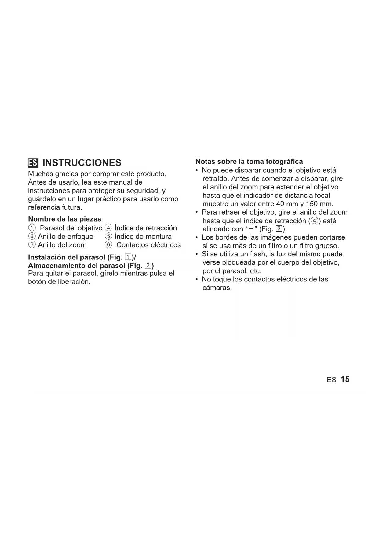 INSTRUCCIONES Muchas gracias por comprar este producto. Antes de usarlo, lea este manual de instrucciones para proteger su seguridad, y guárdelo en un lugar práctico para usarlo como referencia futura. Nombre de las piezas 1 Parasol del objetivo 2 Anillo de enfoque 3 Anillo del zoom 4 Índice de retracción 5 Índice de montura 6 Contactos eléctricos Instalación del parasol (Fig. 1)/ Almacenamiento del parasol (Fig. 2) Para quitar el parasol, gírelo mientras pulsa el botón de liberación. Notas sobre la toma fotográfica