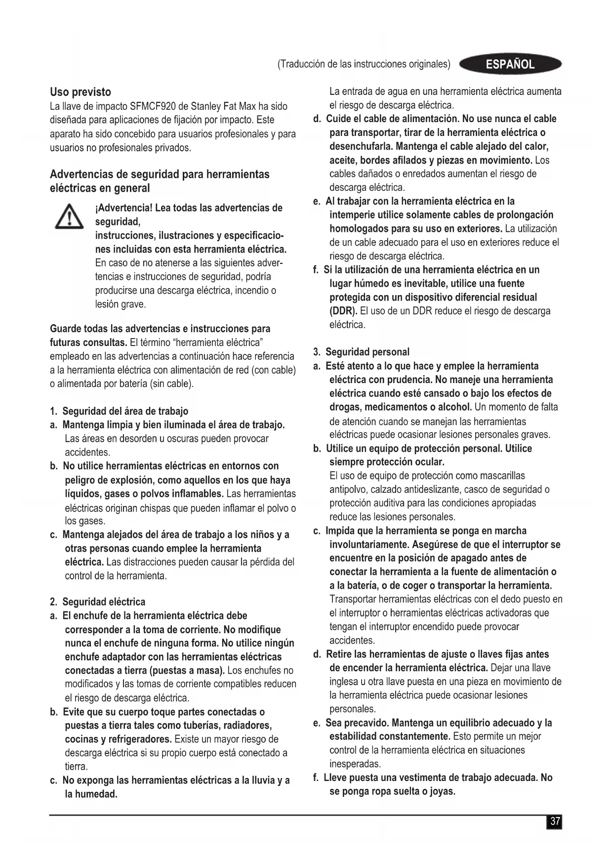 Llave de impacto sin cable - SFMCF920 STANLEY FATMAX declara que los productos descritos en "Datos técnicos" cumplen las siguientes normas EN62841- 1:2015, EN62841-2-2: 2014. Estos productos también cumplen las directivas 2006/42/CE, 2014/30/UE y 2011/65/UE. Para más información, póngase en contacto con STANLEY FATMAX en la siguiente dirección o consulte la parte posterior del manual. Para más información, póngase en contacto con STANLEY FATMAX en la siguiente dirección o consulte la parte posterior del manual. El abajo rmante es el responsable de la elaboración de la documentación técnica y expide la presente declaración en nombre y representación de STANLEY FATMAX. Patrick Diepenbach Director General, Benelux STANLEY FATMAX, Egide Walschaertsstraat 14-18 2800 Mechelen, Bélgica 19/04/2021 Garantía Stanley Fat Max confía en la calidad de sus productos y ofrece a los consumidores una garantía de 12 meses a partir de la fecha de compra. Esta garantía es adicional a sus derechos legales y no los menoscaba en modo alguno. La garantía es válida dentro de los territorios de los Estados Miembros de la Unión Europea y del Área de Libre Comercio Europea. Para reclamar la garantía, la reclamación se deberá presentar de conformidad con las condiciones de Stanley FatMax, y se deberá presentar el justificante de compra al vendedor o al agente técnico autorizado. Las condiciones de la garantía de 1 años de Stanley FatMax y la ubicación de su agente técnico autorizado más cercano se pueden obtener en Internet en www.2helpU.com o poniéndose en contacto con su oficina local de Stanley FatMax en la dirección que se indica en este manual. Visite nuestro sitio web www.stanley.eu/3 para registrar su nuevo producto FatMax y recibir noticias sobre nuevos productos y ofertas especiales. (Tradução das instruções originais) PORTUGUÊS Utilização pretendida A sua chave de impacto Stanley Fat Max SFMCF920 foi concebida para aplicações de xação por impacto. Este aparelho destina-se a utilização prossional bem como a utilizadores privados não prossionais. Avisos de segurança gerais sobre ferramentas eléctricas Atenção! Leia todos os avisos de segurança, instruções, ilustrações e especicações for- necidas com esta ferramenta eléctrica. O não cumprimento dos seguintes avisos e instruções pode resultar em choque eléctrico, incêndio e/ou ferimentos graves. Guarde todos os avisos e instruções para futura referência. O termo “ferramenta eléctrica” utilizado a seguir refere-se a ferramentas eléctricas com ligação à corrente eléctrica (com o) ou com bateria (sem o).