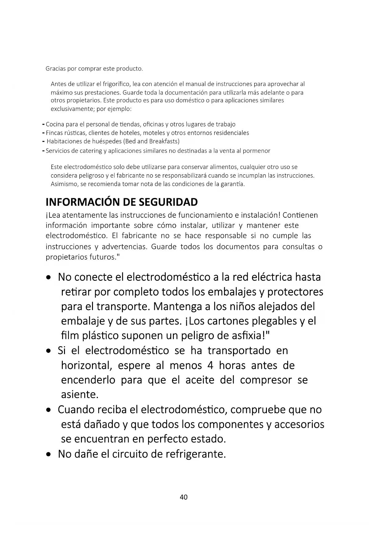 - Retire la puerta Gracias por comprar este producto. Antes de utilizar el frigorífico, lea con atención el manual de instrucciones para aprovechar al máximo sus prestaciones. Guarde toda la documentación para utilizarla más adelante o para otros propietarios. Este producto es para uso doméstico o para aplicaciones similares exclusivamente; por ejemplo: - Cocina para el personal de tiendas, oficinas y otros lugares de trabajo - Fincas rústicas, clientes de hoteles, moteles y otros entornos residenciales - Habitaciones de huéspedes (Bed and Breakfasts) - Servicios de catering y aplicaciones similares no destinadas a la venta al pormenor Este electrodoméstico solo debe utilizarse para conservar alimentos, cualquier otro uso se considera peligroso y el fabricante no se responsabilizará cuando se incumplan las instrucciones. Asimismo, se recomienda tomar nota de las condiciones de la garantía. p. 5840