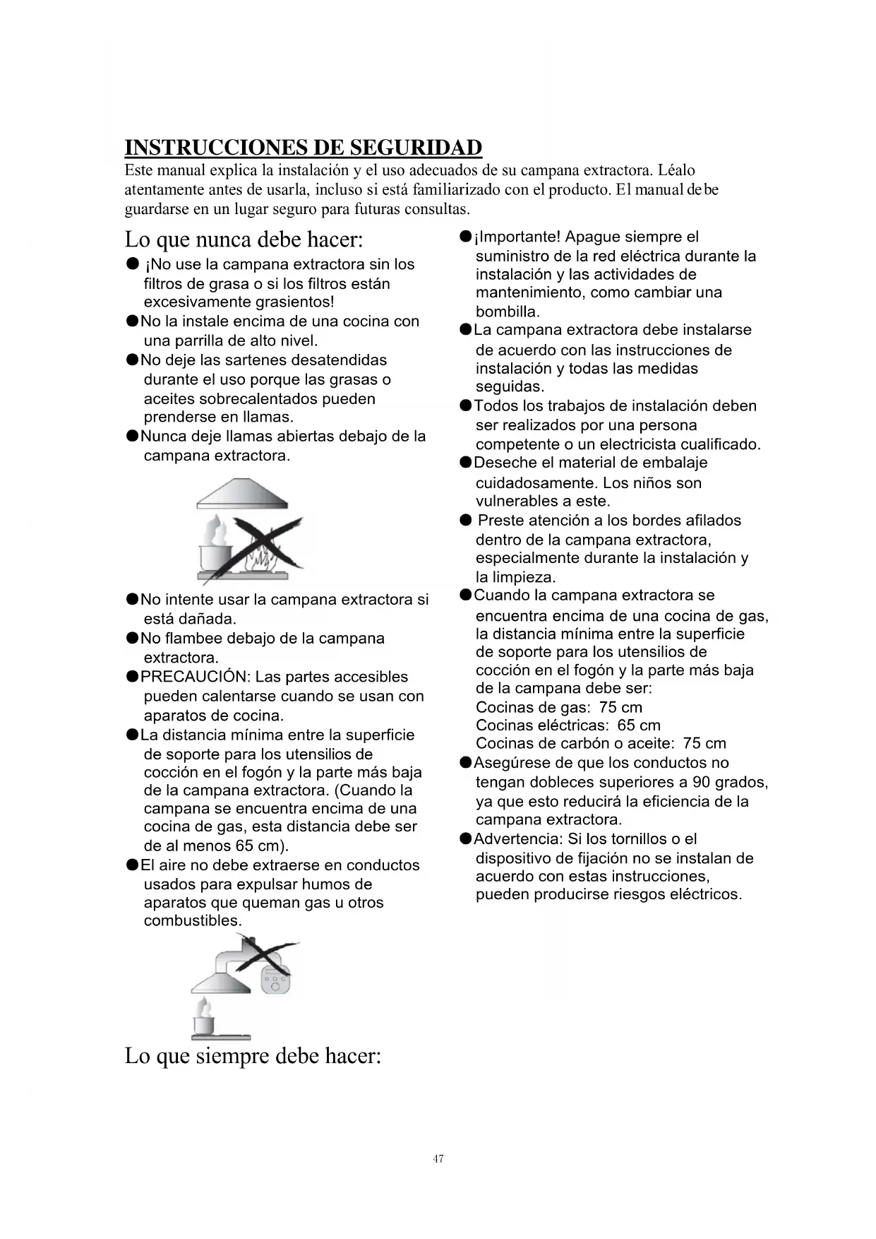 Este manual explica la instalación y el uso adecuados de su campana extractora. Léalo atentamente antes de usarla, incluso si está familiarizado con el producto. El manual de be guardarse en un lugar seguro para futuras consultas. Lo que nunca debe hacer: ● ¡No use la campana extractora sin los filtros de grasa o si los filtros están excesivamente grasientos! ●No la instale encima de una cocina con una parrilla de alto nivel. ●No deje las sartenes desatendidas durante el uso porque las grasas o aceites sobrecalentados pueden prenderse en llamas. ●Nunca deje llamas abiertas debajo de la campana extractora. ●No intente usar la campana extractora si está dañada. ●No flambee debajo de la campana extractora. ●PRECAUCIÓN: Las partes accesibles pueden calentarse cuando se usan con aparatos de cocina. ●La distancia mínima entre la superficie de soporte para los utensilios de cocción en el fogón y la parte más baja de la campana extractora. (Cuando la campana se encuentra encima de una cocina de gas, esta distancia debe ser de al menos 65 cm). ●El aire no debe extraerse en conductos usados para expulsar humos de aparatos que queman gas u otros combustibles. Lo que siempre debe hacer: ●¡Importante! Apague siempre el suministro de la red eléctrica durante la instalación y las actividades de mantenimiento, como cambiar una bombilla. ●La campana extractora debe instalarse de acuerdo con las instrucciones de instalación y todas las medidas seguidas. ●Todos los trabajos de instalación deben ser realizados por una persona competente o un electricista cualificado. ●Deseche el material de embalaje cuidadosamente. Los niños son vulnerables a este. ● Preste atención a los bordes afilados dentro de la campana extractora, especialmente durante la instalación y la limpieza. ●Cuando la campana extractora se encuentra encima de una cocina de gas, la distancia mínima entre la superficie de soporte para los utensilios de cocción en el fogón y la parte más baja de la campana debe ser: Cocinas de gas: 75 cm Cocinas eléctricas: 65 cm Cocinas de carbón o aceite: 75 cm ●Asegúrese de que los conductos no tengan dobleces superiores a 90 grados, ya que esto reducirá la eficiencia de la campana extractora. ●Advertencia: Si los tornillos o el dispositivo de fijación no se instalan de acuerdo con estas instrucciones, pueden producirse riesgos eléctricos. 47Lo que siempre debe hacer: ●Coloque siempre tapas en ollas y sartenes cuando cocine en una cocina de gas. ●Cuando se encuentre en el modo de extracción, la campana extractora estará extrayendo el aire de la habitación. Asegúrese de que se estén observando las medidas de ventilación adecuadas. La campana extractora elimina los olores de la habitación, pero no el vapor. ●La campana extractora es solo para uso doméstico. ●Si el cable de alimentación presenta daños, debe ser sustituido por el fabricante, por un técnico cualificado o por cualquier persona autorizada para evitar cualquier peligro. ●Este electrodoméstico puede ser utilizado por niños a partir de 8 años y por personas con capacidades físicas, sensoriales o mentales reducidas, o sin experiencia o conocimientos previos, siempre y cuando previamente hayan recibido la supervisión y las instrucciones necesarias para utilizar el aparato de forma segura y comprendan los riesgos que implica. Los niños no deben jugar con este electrodoméstico. Las operaciones de limpieza y mantenimiento no deben ser realizadas por niños sin supervisión. ●Advertencia: Antes de obtener acceso a los terminales, todos los circuitos de suministro deben estar desconectados. Lo que siempre debe hacer: ●Precaución: El electrodoméstico y sus accesorios se pueden calentar durante el uso. Trate de evitar tocar los elementos de calentamiento. Los niños menores de 8 años deben mantenerse alejados a menos que estén bajo supervisión permanente. ●La habitación debe estar adecuadamente ventilada cuando la campana extractora se usa al mismo tiempo que electrodomésticos que quemen gas u otros combustibles. ●Existe un riesgo de incendio si la limpieza no se lleva a cabo de acuerdo con las instrucciones. ●Deben cumplirse las normativas relativas a la extracción de aire. ●Limpie su electrodoméstico periódicamente siguiendo el método indicado en el capítulo MANTENIMIENTO. ●Por razones de seguridad, use solo tornillos de fijación o montaje del tamaño recomendado en este manual de instrucciones. ●En cuanto a los detalles sobre el método y la frecuencia de limpieza, consulte la sección de mantenimiento y limpieza en el manual de instrucciones. ●Las operaciones de limpieza y mantenimiento no deben ser realizadas por niños sin supervisión. ●Cuando la campana extractora y los electrodomésticos que funcionan con energía que no sea electricidad están funcionando simultáneamente, la presión negativa en la habitación no debe superar los 4 Pa (4 x 10-5 bar). ●ADVERTENCIA: Peligro de incendio: no almacene artículos sobre las superficies de cocción. ●No utilice un limpiador a vapor. ●NUNCA intente apagar un incendio con agua; debe apagar el aparato y cubrir posteriormente la llama, p. ej., con una tapa o una manta contra incendios. 48INSTALACIÓN