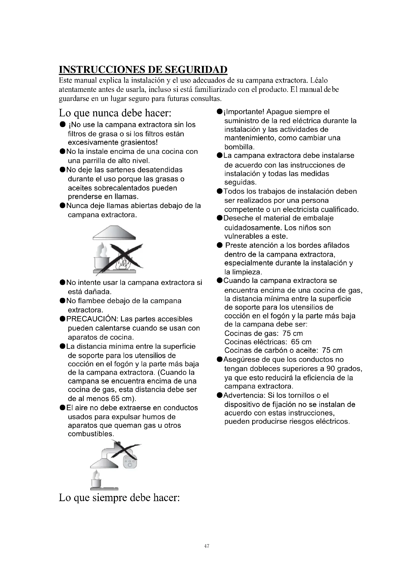 Este manual explica la instalación y el uso adecuados de su campana extractora. Léalo atentamente antes de usarla, incluso si está familiarizado con el producto. El manual de be guardarse en un lugar seguro para futuras consultas. Lo que nunca debe hacer: ● ¡No use la campana extractora sin los filtros de grasa o si los filtros están excesivamente grasientos! ●No la instale encima de una cocina con una parrilla de alto nivel. ●No deje las sartenes desatendidas durante el uso porque las grasas o aceites sobrecalentados pueden prenderse en llamas. ●Nunca deje llamas abiertas debajo de la campana extractora. ●No intente usar la campana extractora si está dañada. ●No flambee debajo de la campana extractora. ●PRECAUCIÓN: Las partes accesibles pueden calentarse cuando se usan con aparatos de cocina. ●La distancia mínima entre la superficie de soporte para los utensilios de cocción en el fogón y la parte más baja de la campana extractora. (Cuando la campana se encuentra encima de una cocina de gas, esta distancia debe ser de al menos 65 cm). ●El aire no debe extraerse en conductos usados para expulsar humos de aparatos que queman gas u otros combustibles. Lo que siempre debe hacer: ●¡Importante! Apague siempre el suministro de la red eléctrica durante la instalación y las actividades de mantenimiento, como cambiar una bombilla. ●La campana extractora debe instalarse de acuerdo con las instrucciones de instalación y todas las medidas seguidas. ●Todos los trabajos de instalación deben ser realizados por una persona competente o un electricista cualificado. ●Deseche el material de embalaje cuidadosamente. Los niños son vulnerables a este. ● Preste atención a los bordes afilados dentro de la campana extractora, especialmente durante la instalación y la limpieza. ●Cuando la campana extractora se encuentra encima de una cocina de gas, la distancia mínima entre la superficie de soporte para los utensilios de cocción en el fogón y la parte más baja de la campana debe ser: Cocinas de gas: 75 cm Cocinas eléctricas: 65 cm Cocinas de carbón o aceite: 75 cm ●Asegúrese de que los conductos no tengan dobleces superiores a 90 grados, ya que esto reducirá la eficiencia de la campana extractora. ●Advertencia: Si los tornillos o el dispositivo de fijación no se instalan de acuerdo con estas instrucciones, pueden producirse riesgos eléctricos. 47Lo que siempre debe hacer: ●Coloque siempre tapas en ollas y sartenes cuando cocine en una cocina de gas. ●Cuando se encuentre en el modo de extracción, la campana extractora estará extrayendo el aire de la habitación. Asegúrese de que se estén observando las medidas de ventilación adecuadas. La campana extractora elimina los olores de la habitación, pero no el vapor. ●La campana extractora es solo para uso doméstico. ●Si el cable de alimentación presenta daños, debe ser sustituido por el fabricante, por un técnico cualificado o por cualquier persona autorizada para evitar cualquier peligro. ●Este electrodoméstico puede ser utilizado por niños a partir de 8 años y por personas con capacidades físicas, sensoriales o mentales reducidas, o sin experiencia o conocimientos previos, siempre y cuando previamente hayan recibido la supervisión y las instrucciones necesarias para utilizar el aparato de forma segura y comprendan los riesgos que implica. Los niños no deben jugar con este electrodoméstico. Las operaciones de limpieza y mantenimiento no deben ser realizadas por niños sin supervisión. ●Advertencia: Antes de obtener acceso a los terminales, todos los circuitos de suministro deben estar desconectados. Lo que siempre debe hacer: ●Precaución: El electrodoméstico y sus accesorios se pueden calentar durante el uso. Trate de evitar tocar los elementos de calentamiento. Los niños menores de 8 años deben mantenerse alejados a menos que estén bajo supervisión permanente. ●La habitación debe estar adecuadamente ventilada cuando la campana extractora se usa al mismo tiempo que electrodomésticos que quemen gas u otros combustibles. ●Existe un riesgo de incendio si la limpieza no se lleva a cabo de acuerdo con las instrucciones. ●Deben cumplirse las normativas relativas a la extracción de aire. ●Limpie su electrodoméstico periódicamente siguiendo el método indicado en el capítulo MANTENIMIENTO. ●Por razones de seguridad, use solo tornillos de fijación o montaje del tamaño recomendado en este manual de instrucciones. ●En cuanto a los detalles sobre el método y la frecuencia de limpieza, consulte la sección de mantenimiento y limpieza en el manual de instrucciones. ●Las operaciones de limpieza y mantenimiento no deben ser realizadas por niños sin supervisión. ●Cuando la campana extractora y los electrodomésticos que funcionan con energía que no sea electricidad están funcionando simultáneamente, la presión negativa en la habitación no debe superar los 4 Pa (4 x 10-5 bar). ●ADVERTENCIA: Peligro de incendio: no almacene artículos sobre las superficies de cocción. ●No utilice un limpiador a vapor. ●NUNCA intente apagar un incendio con agua; debe apagar el aparato y cubrir posteriormente la llama, p. ej., con una tapa o una manta contra incendios. 48INSTALACIÓN
