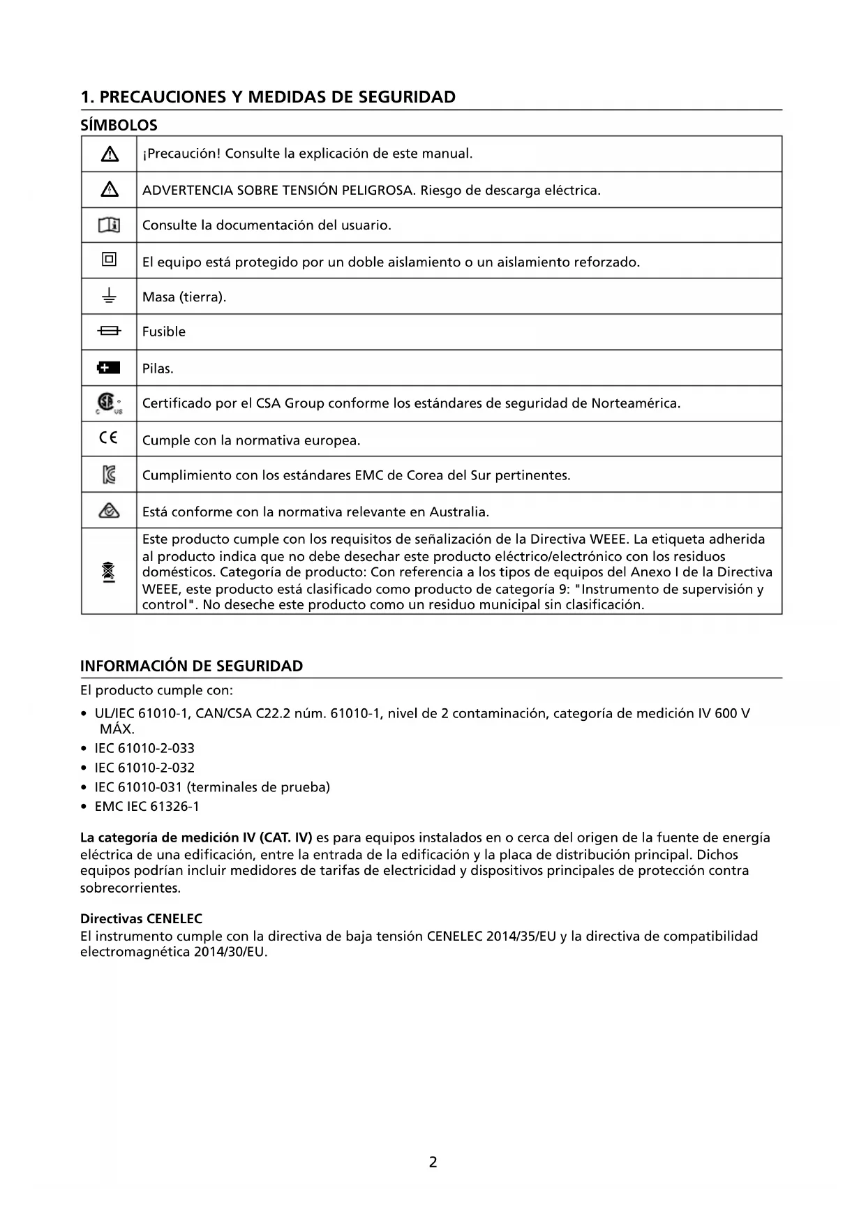 - EMC IEC 61326-1 La categoría de medición IV (CAT. IV) es para equipos instalados en o cerca del origen de la fuente de energía eléctrica de una edicación, entre la entrada de la edicación y la placa de distribución principal. Dichos equipos podrían incluir medidores de tarifas de electricidad y dispositivos principales de protección contra sobrecorrientes. Directivas CENELEC El instrumento cumple con la directiva de baja tensión CENELEC 2014/35/EU y la directiva de compatibilidad electromagnética 2014/30/EU.3 Advertencias: Leer antes de usar Para evitar la posibilidad de descargas eléctricas o lesiones personales: