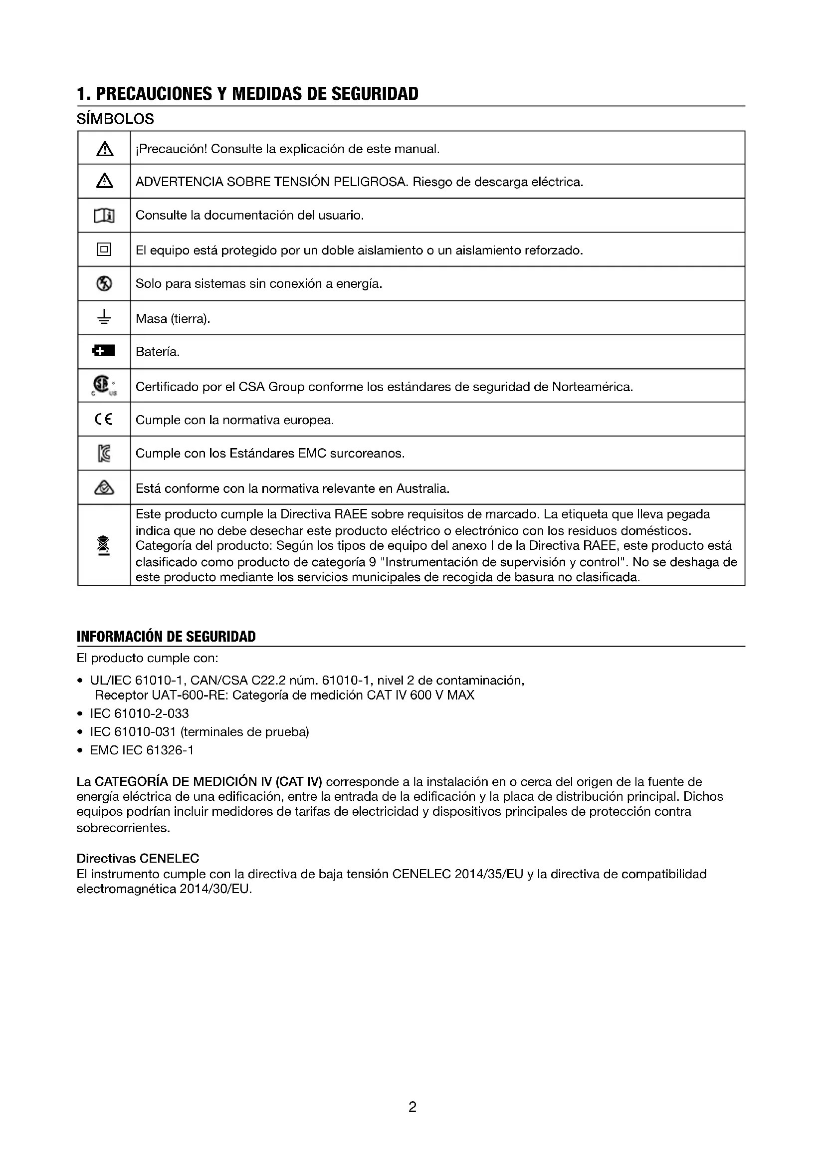 - EMC IEC 61326-1 La CATEGORÍA DE MEDICIÓN lV (CAT IV) corresponde a la instalación en o cerca del origen de la fuente de energía eléctrica de una edificación, entre la entrada de la edificación y la placa de distribución principal. Dichos equipos podrían incluir medidores de tarifas de electricidad y dispositivos principales de protección contra sobrecorrientes. Directivas CENELEC El instrumento cumple con la directiva de baja tensión CENELEC 2014/35/EU y la directiva de compatibilidad electromagnética 2014/30/EU.3 Advertencias: Leer antes de usar Para evitar la posibilidad de descargas eléctricas o lesiones personales: