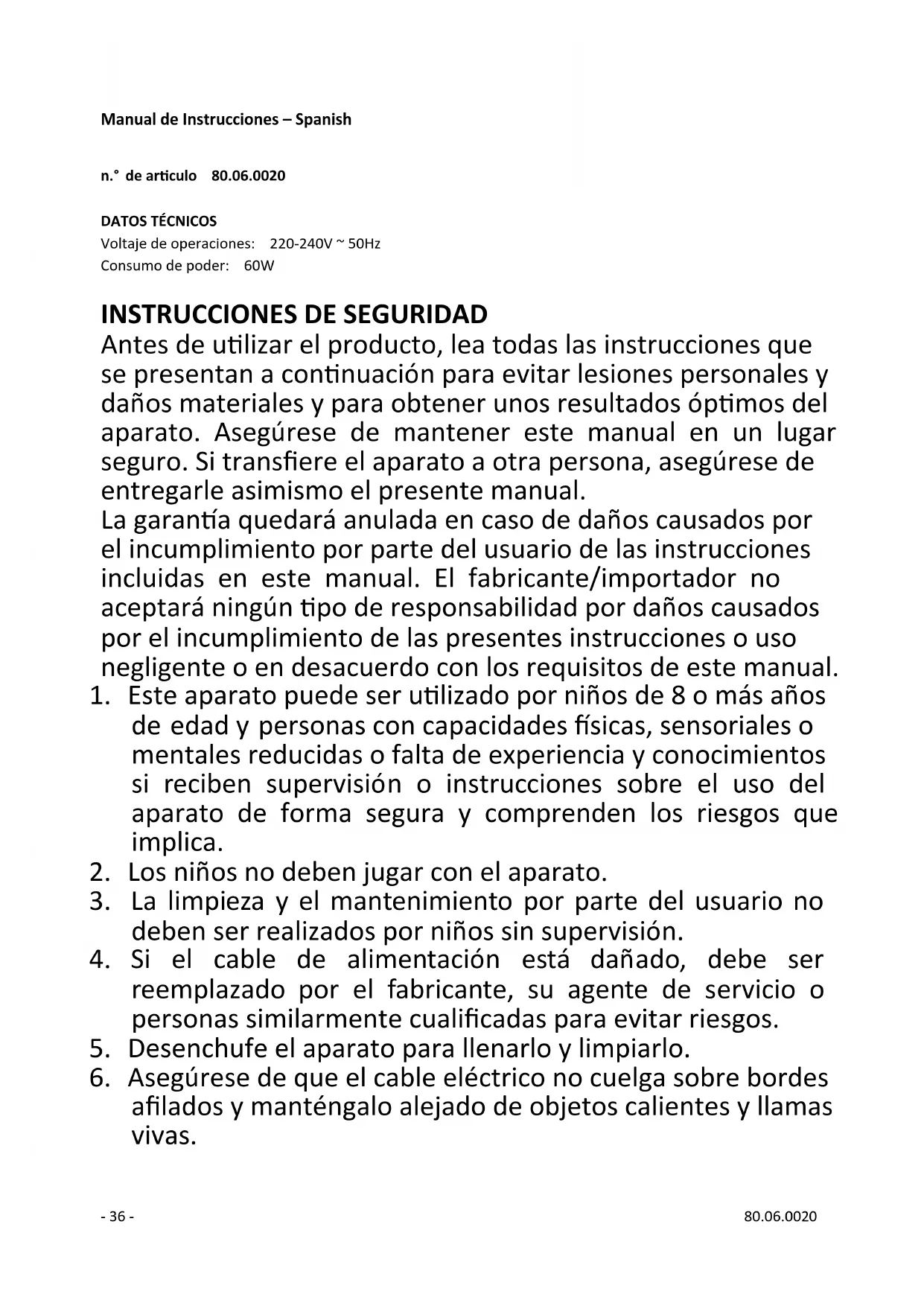 Antes de utilizar el producto, lea todas las instrucciones que se presentan a continuación para evitar lesiones personales y daños materiales y para obtener unos resultados óptimos del aparato. Asegúrese de mantener este manual en un lugar seguro. Si transfiere el aparato a otra persona, asegúrese de entregarle asimismo el presente manual. La garantía quedará anulada en caso de daños causados por el incumplimiento por parte del usuario de las instrucciones incluidas en este manual. El fabricante/importador no aceptará ningún tipo de responsabilidad por daños causados por el incumplimiento de las presentes instrucciones o uso negligente o en desacuerdo con los requisitos de este manual.