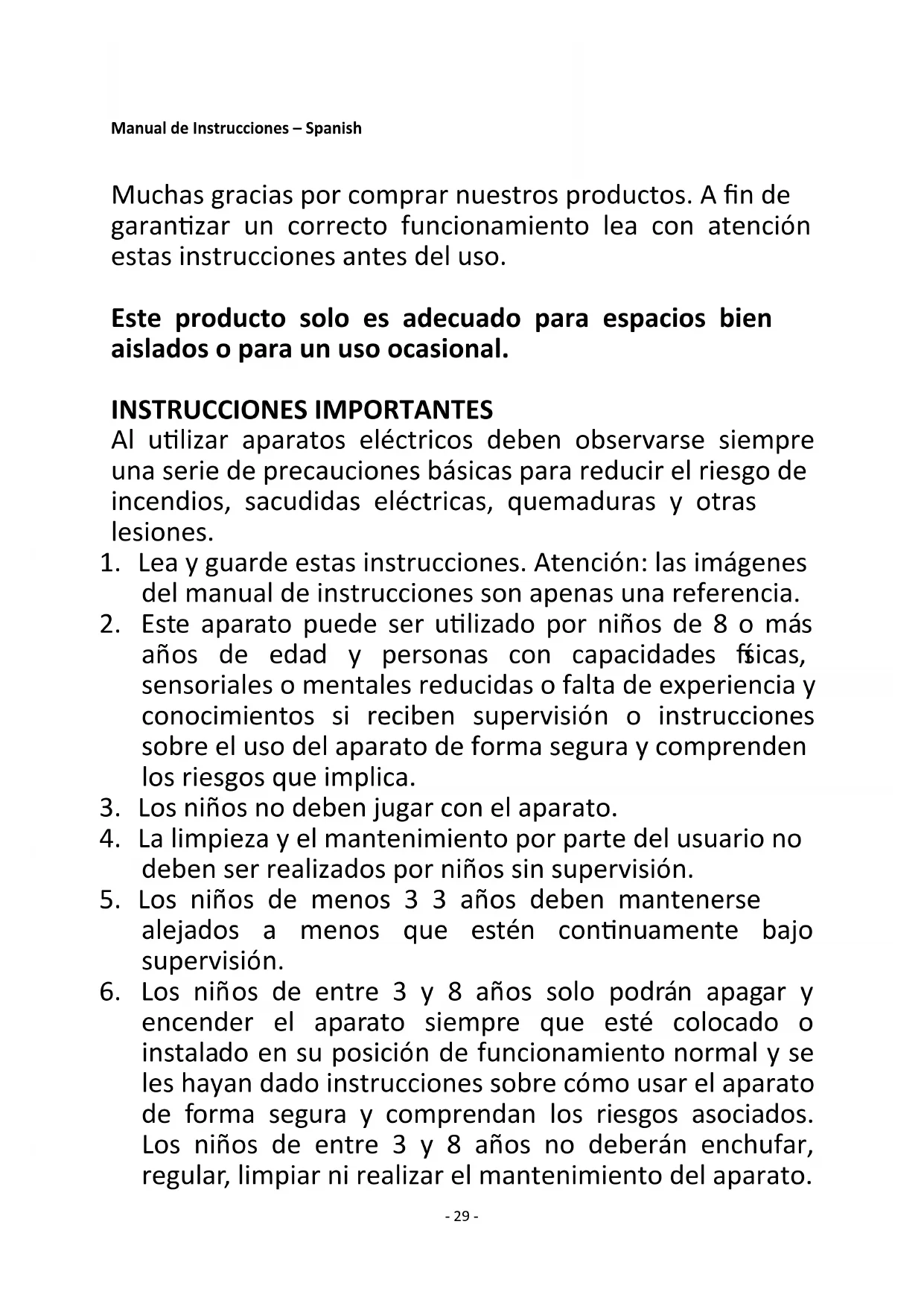 Opfylder kravene i rådets direktiver: KOMMISSIONENS FORORDNING (EU) nr. 2015/1188 fra d. 28 april 2015 og æ ndring af KOMMISSIONENS FORORDNING (EU) 2016/2282 med implementering af Europa-Parlamentets direktiv 2009/125/EF og rådets krav til miljøvenligt design for lokale rumopvarmere Med hensyn til oplysninger til forbrugerne om, hvordan man installerer, bruger og vedligeholder produktet, samt WEEE-oplysningerne, bedes du venligst se brugervejledningen, der følger med produktet.- 29 - Manual de Instrucciones – Spanish Muchas gracias por comprar nuestros productos. A fin de garantizar un correcto funcionamiento lea con atención estas instrucciones antes del uso. Este producto solo es adecuado para espacios bien aislados o para un uso ocasional. INSTRUCCIONES IMPORTANTES Al utilizar aparatos eléctricos deben observarse siempre una serie de precauciones básicas para reducir el riesgo de incendios, sacudidas eléctricas, quemaduras y otras lesiones.
