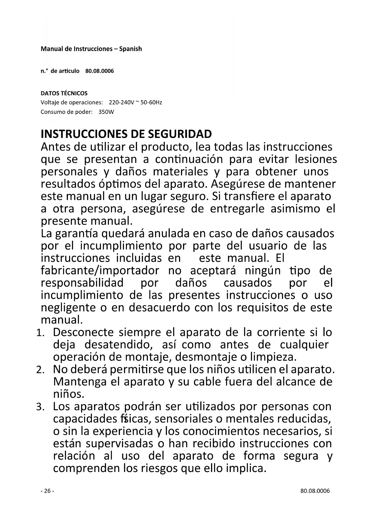 Antes de utilizar el producto, lea todas las instrucciones que se presentan a continuación para evitar lesiones personales y daños materiales y para obtener unos resultados óptimos del aparato. Asegúrese de mantener este manual en un lugar seguro. Si transfiere el aparato a otra persona, asegúrese de entregarle asimismo el presente manual. La garantía quedará anulada en caso de daños causados por el incumplimiento por parte del usuario de las instrucciones incluidas en este manual. El fabricante/importador no aceptará ningún tipo de responsabilidad por daños causados por el incumplimiento de las presentes instrucciones o uso negligente o en desacuerdo con los requisitos de este manual.