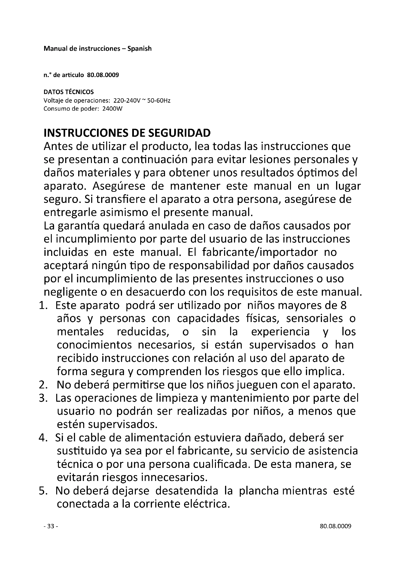 Antes de utilizar el producto, lea todas las instrucciones que se presentan a continuación para evitar lesiones personales y daños materiales y para obtener unos resultados óptimos del aparato. Asegúrese de mantener este manual en un lugar seguro. Si transfiere el aparato a otra persona, asegúrese de entregarle asimismo el presente manual. La garantía quedará anulada en caso de daños causados por el incumplimiento por parte del usuario de las instrucciones incluidas en este manual. El fabricante/importador no aceptará ningún tipo de responsabilidad por daños causados por el incumplimiento de las presentes instrucciones o uso negligente o en desacuerdo con los requisitos de este manual.
