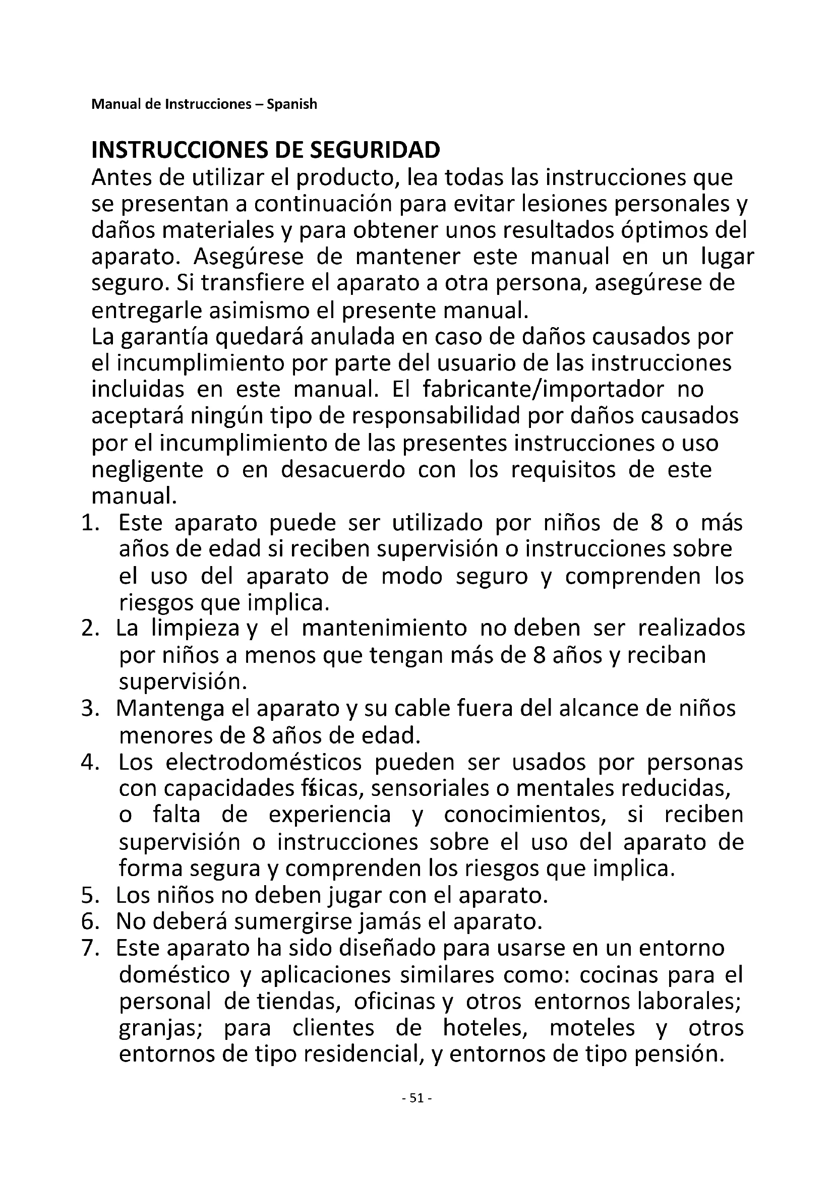 Antes de utilizar el producto, lea todas las instrucciones que se presentan a continuación para evitar lesiones personales y daños materiales y para obtener unos resultados óptimos del aparato. Asegúrese de mantener este manual en un lugar seguro. Si transfiere el aparato a otra persona, asegúrese de entregarle asimismo el presente manual. La garantía quedará anulada en caso de daños causados por el incumplimiento por parte del usuario de las instrucciones incluidas en este manual. El fabricante/importador no aceptará ningún tipo de responsabilidad por daños causados por el incumplimiento de las presentes instrucciones o uso negligente o en desacuerdo con los requisitos de este manual.