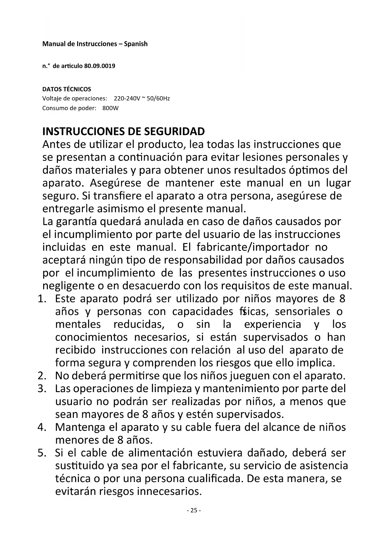 Antes de utilizar el producto, lea todas las instrucciones que se presentan a continuación para evitar lesiones personales y daños materiales y para obtener unos resultados óptimos del aparato. Asegúrese de mantener este manual en un lugar seguro. Si transfiere el aparato a otra persona, asegúrese de entregarle asimismo el presente manual. La garantía quedará anulada en caso de daños causados por el incumplimiento por parte del usuario de las instrucciones incluidas en este manual. El fabricante/importador no aceptará ningún tipo de responsabilidad por daños causados por el incumplimiento de las presentes instrucciones o uso negligente o en desacuerdo con los requisitos de este manual.