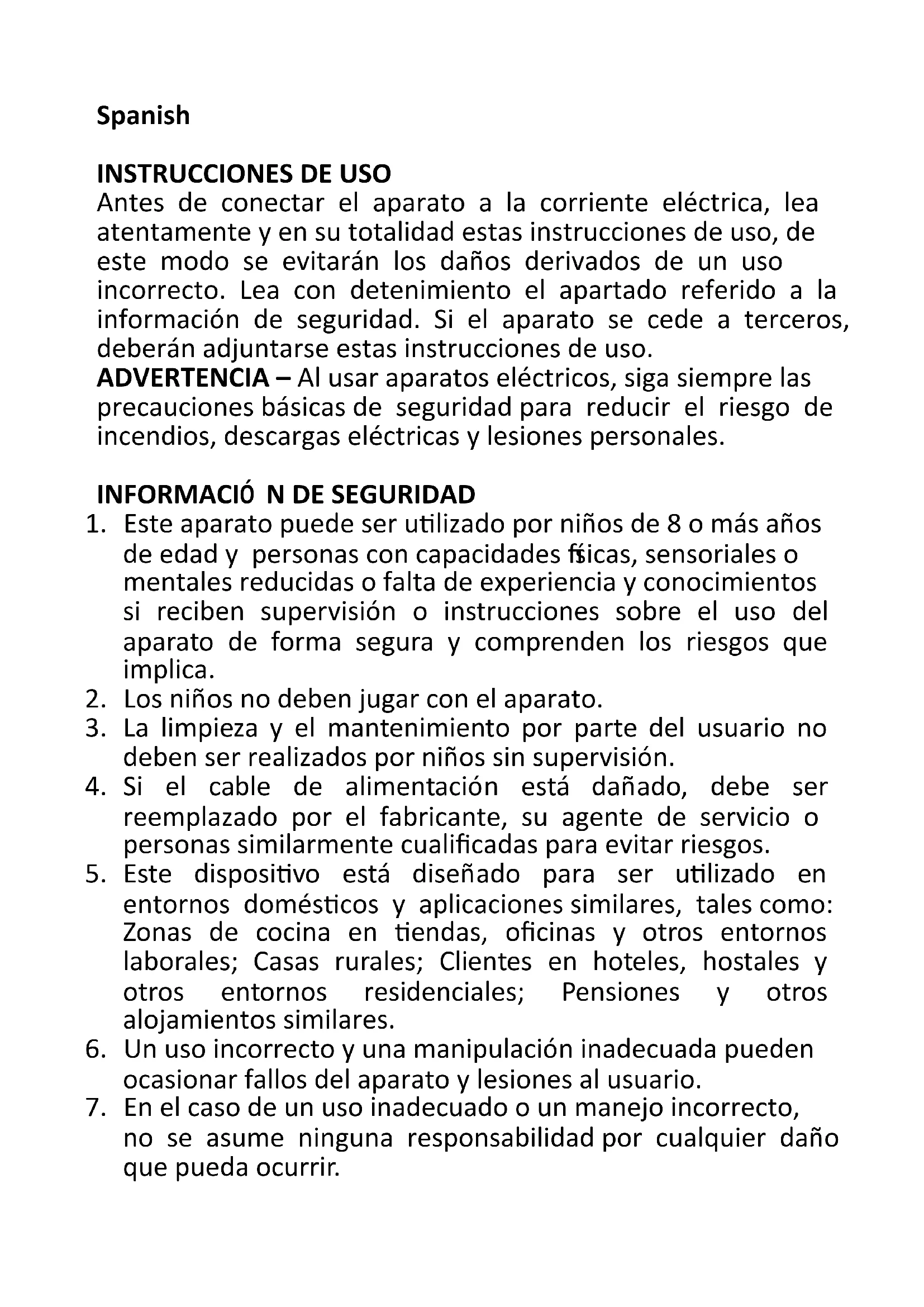 Antes de conectar el aparato a la corriente eléctrica, lea atentamente y en su totalidad estas instrucciones de uso, de este modo se evitarán los daños derivados de un uso incorrecto. Lea con detenimiento el apartado referido a la información de seguridad. Si el aparato se cede a terceros, deberán adjuntarse estas instrucciones de uso. ADVERTENCIA – Al usar aparatos eléctricos, siga siempre las precauciones básicas de seguridad para reducir el riesgo de incendios, descargas eléctricas y lesiones personales.