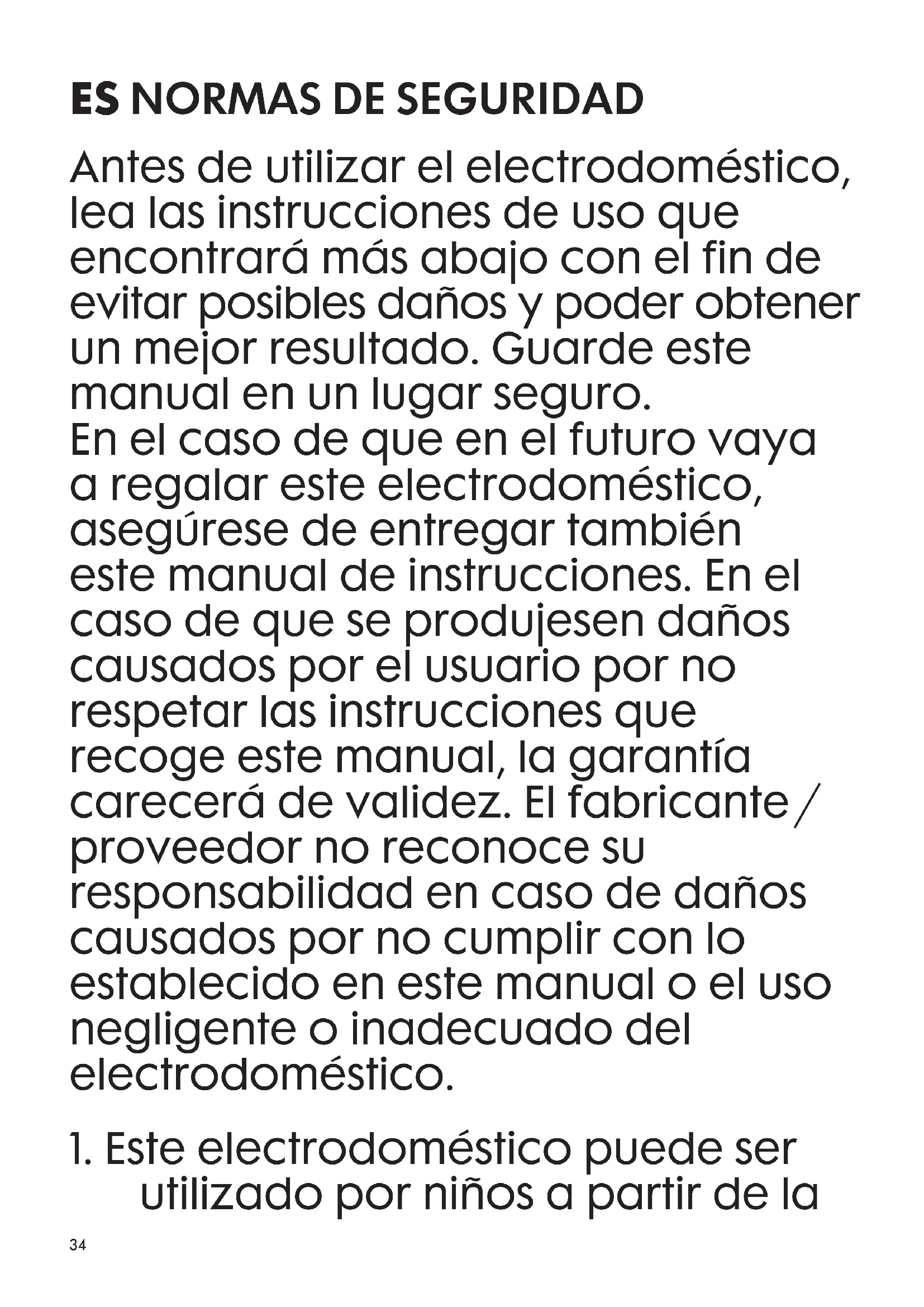 Antes de utilizar el electrodoméstico, lea las instrucciones de uso que encontrará más abajo con el fin de evitar posibles daños y poder obtener un mejor resultado. Guarde este manual en un lugar seguro. En el caso de que en el futuro vaya a regalar este electrodoméstico, asegúrese de entregar también este manual de instrucciones. En el caso de que se produjesen daños causados por el usuario por no respetar las instrucciones que recoge este manual, la garantía carecerá de validez. El fabricante / proveedor no reconoce su responsabilidad en caso de daños causados por no cumplir con lo establecido en este manual o el uso negligente o inadecuado del electrodoméstico.