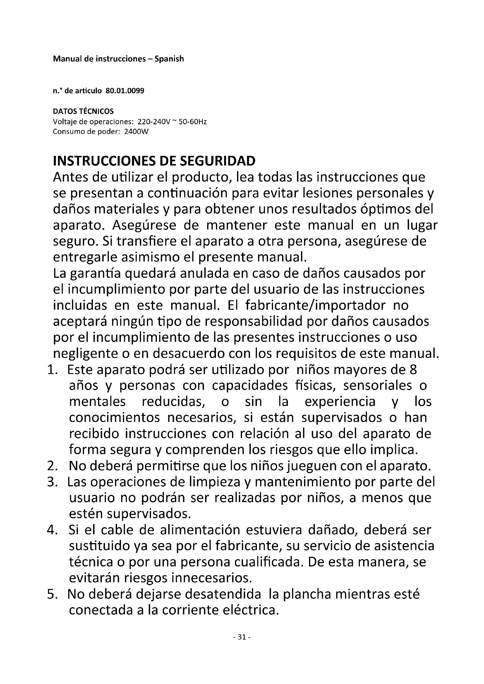 Antes de utilizar el producto, lea todas las instrucciones que se presentan a continuación para evitar lesiones personales y daños materiales y para obtener unos resultados óptimos del aparato. Asegúrese de mantener este manual en un lugar seguro. Si transfiere el aparato a otra persona, asegúrese de entregarle asimismo el presente manual. La garantía quedará anulada en caso de daños causados por el incumplimiento por parte del usuario de las instrucciones incluidas en este manual. El fabricante/importador no aceptará ningún tipo de responsabilidad por daños causados por el incumplimiento de las presentes instrucciones o uso negligente o en desacuerdo con los requisitos de este manual.