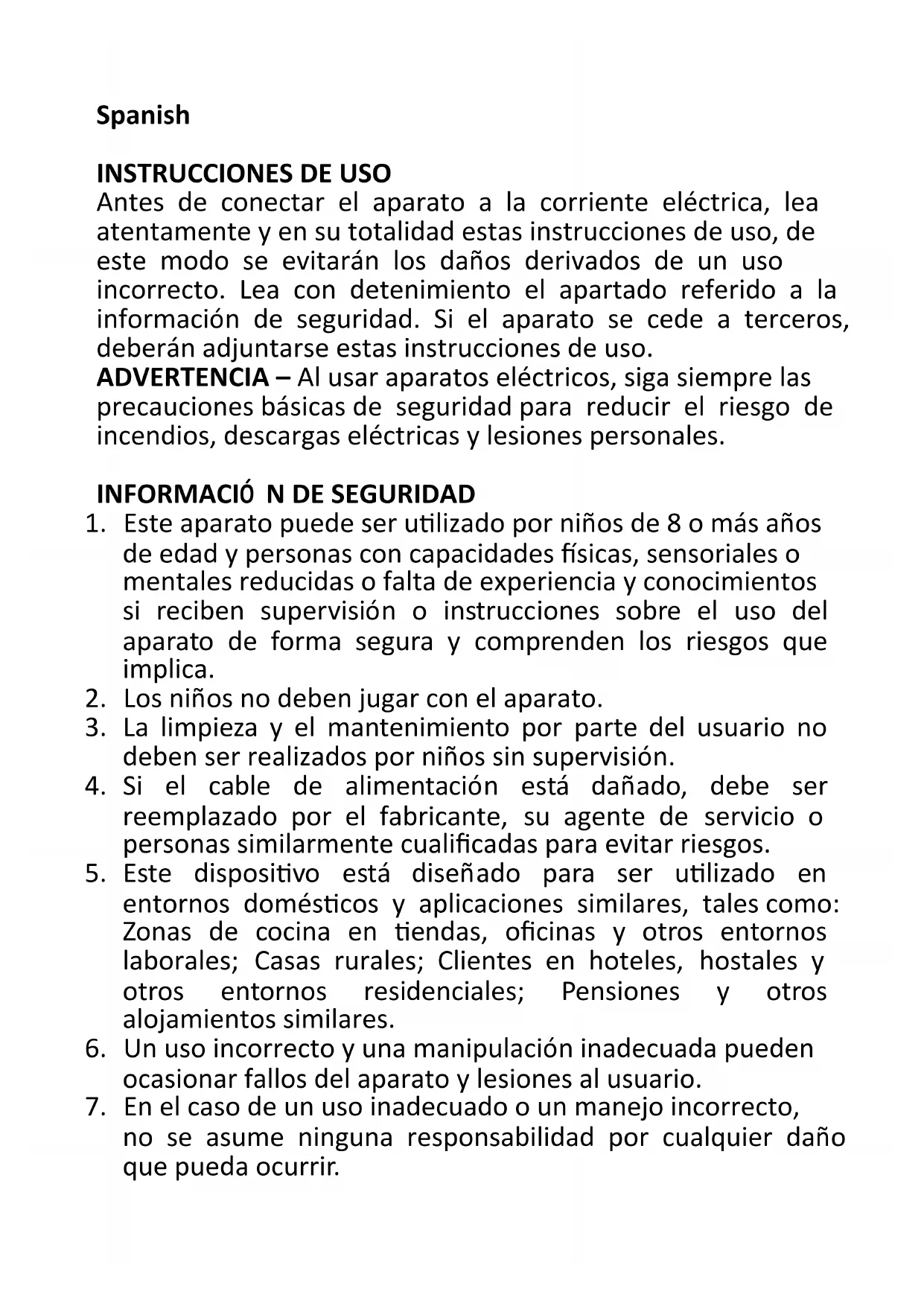 Antes de conectar el aparato a la corriente eléctrica, lea atentamente y en su totalidad estas instrucciones de uso, de este modo se evitarán los daños derivados de un uso incorrecto. Lea con detenimiento el apartado referido a la información de seguridad. Si el aparato se cede a terceros, deberán adjuntarse estas instrucciones de uso. ADVERTENCIA – Al usar aparatos eléctricos, siga siempre las precauciones básicas de seguridad para reducir el riesgo de incendios, descargas eléctricas y lesiones personales.