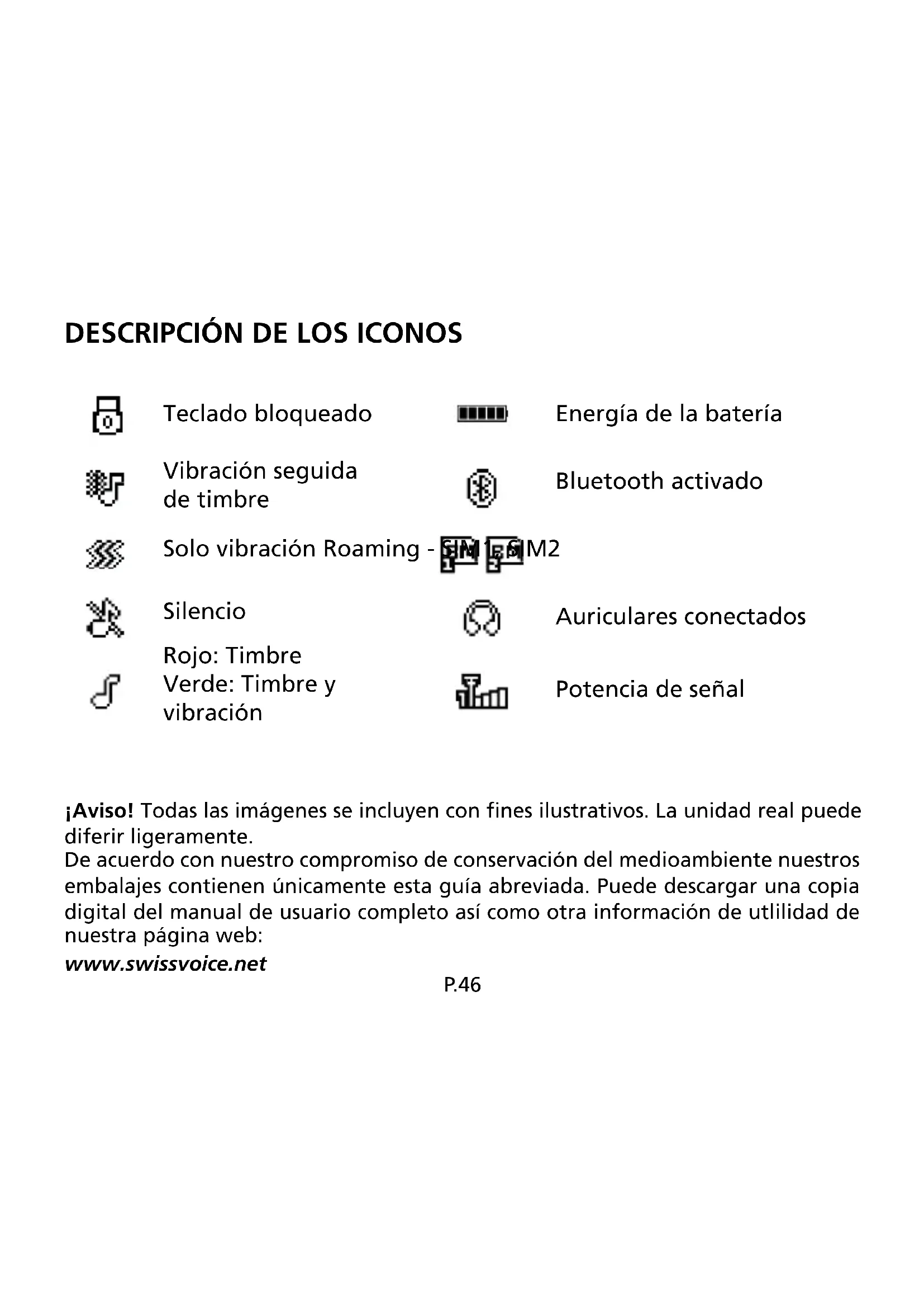 ¡Aviso! Todas las imágenes se incluyen con fines ilustrativos. La unidad real puede diferir ligeramente. De acuerdo con nuestro compromiso de conservación del medioambiente nuestros embalajes contienen únicamente esta guía abreviada. Puede descargar una copia digital del manual de usuario completo así como otra información de utlilidad de nuestra página web: www.swissvoice.net P.46 Rojo: Timbre Verde: Timbre y vibración Energía de la batería Vibración seguida de timbre Bluetooth activado Solo vibración Roaming - SIM1, SIM2 Silencio Potencia de señal Auriculares conectados Teclado bloqueadoP.47 PASOS INICIALES Instalación de la tarjeta SIM, tarjeta de memoria y batería ATENCIÓN: