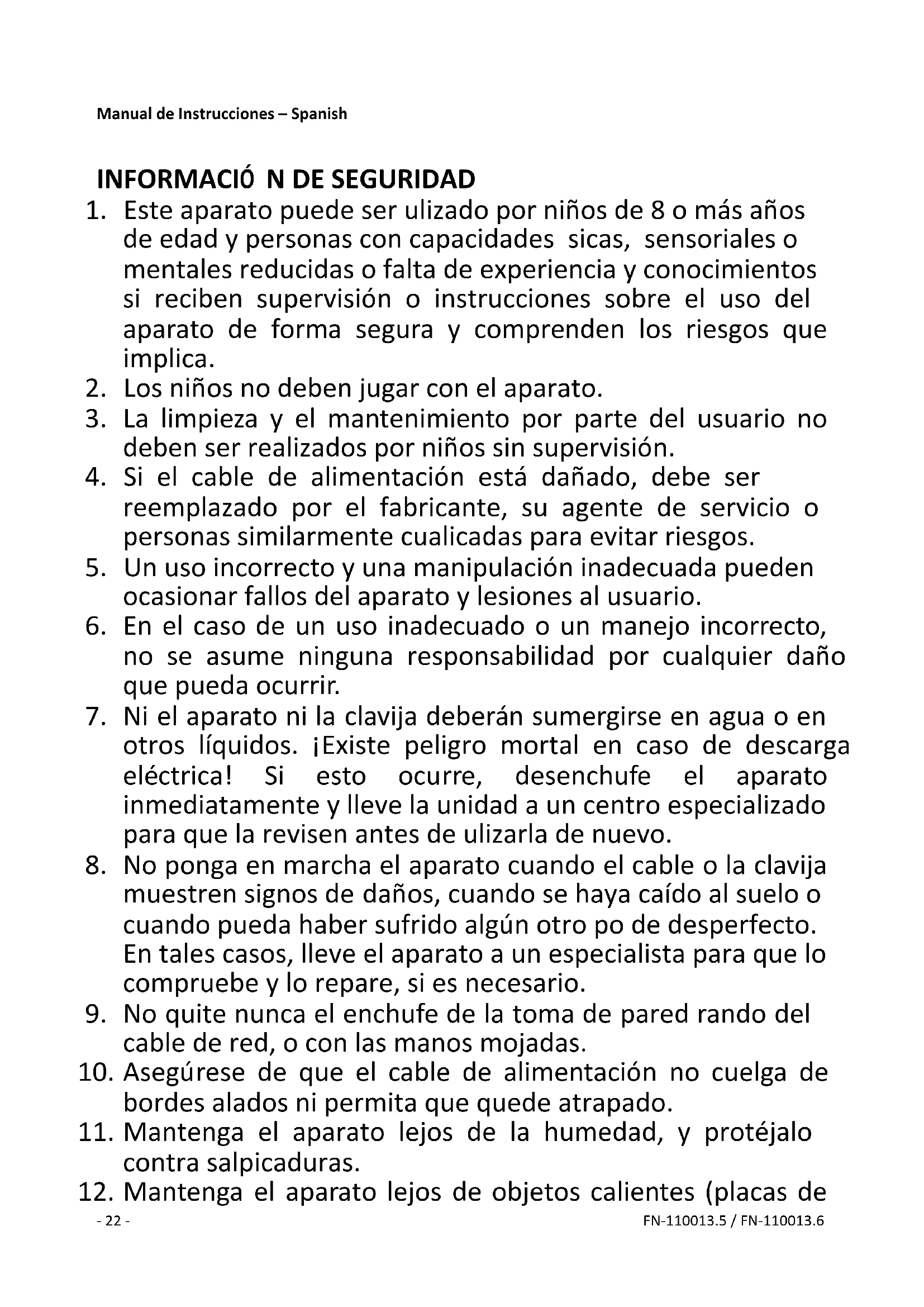 12. Mantenga el aparato lejos de objetos calientes (placas de- 23 - FN-110013.5 / FN-110013.6
