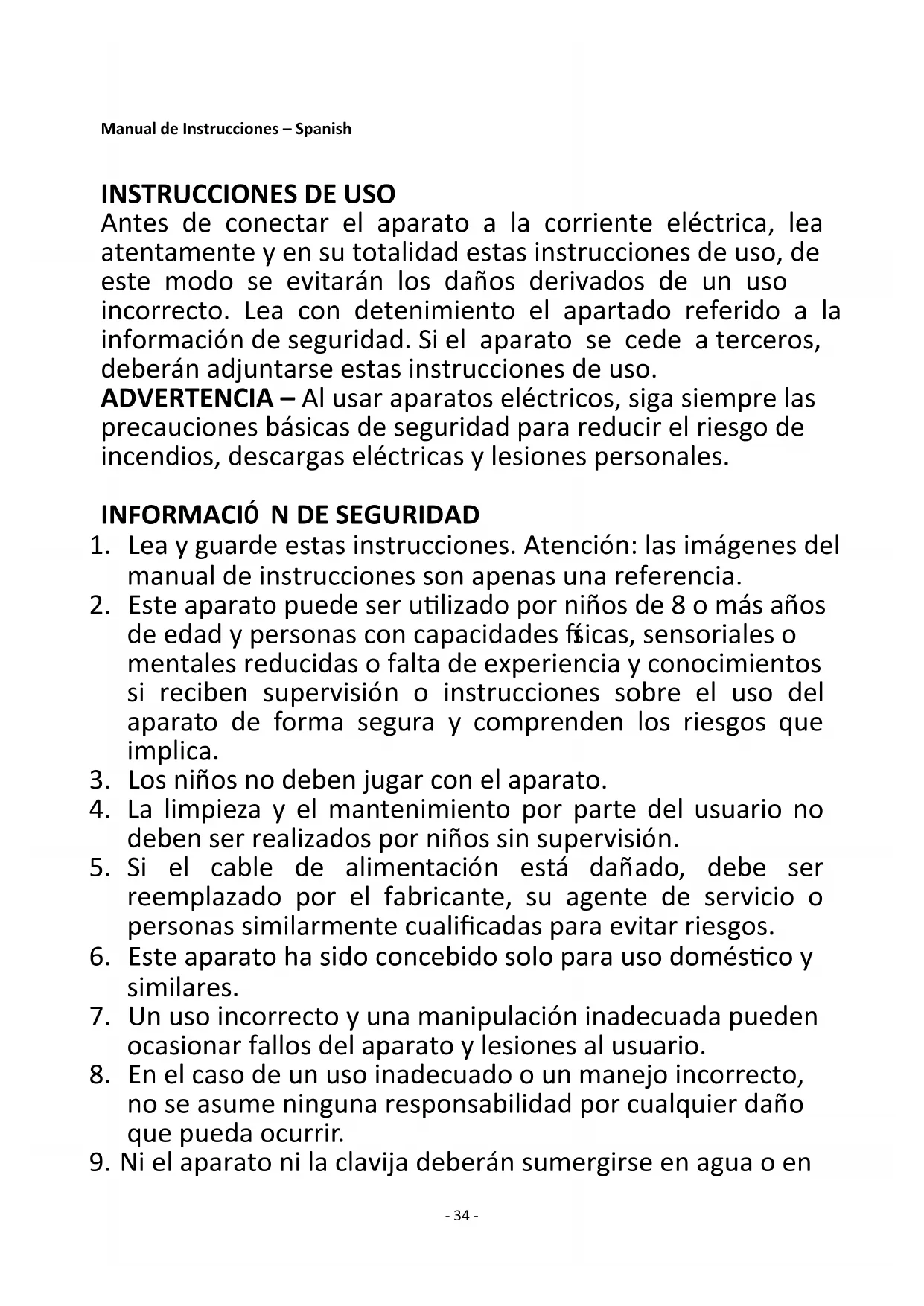 Antes de conectar el aparato a la corriente eléctrica, lea atentamente y en su totalidad estas instrucciones de uso, de este modo se evitarán los daños derivados de un uso incorrecto. Lea con detenimiento el apartado referido a la información de seguridad. Si el aparato se cede a terceros, deberán adjuntarse estas instrucciones de uso. ADVERTENCIA – Al usar aparatos eléctricos, siga siempre las precauciones básicas de seguridad para reducir el riesgo de incendios, descargas eléctricas y lesiones personales.