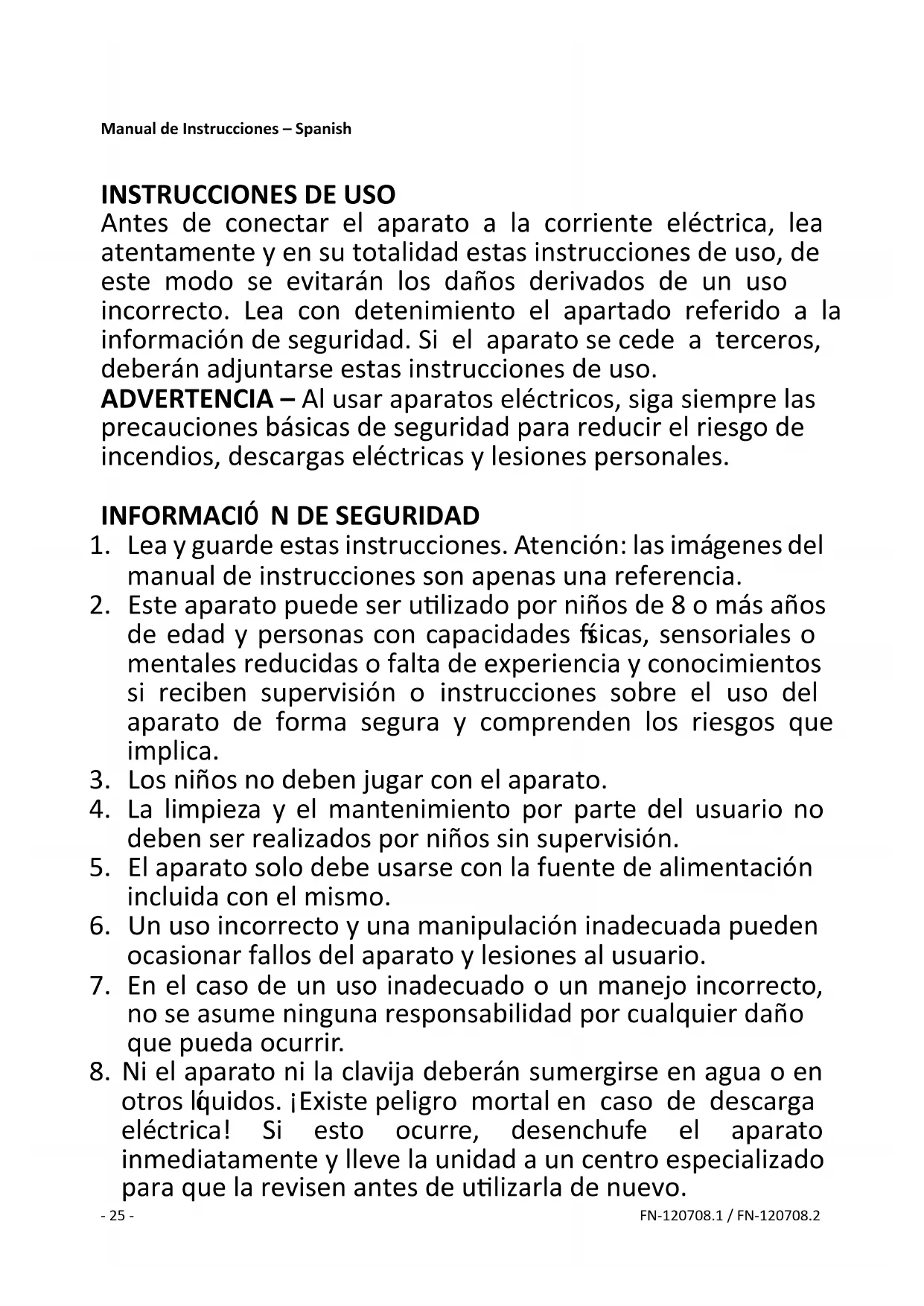 otros líquidos. ¡Existe peligro mortal en caso de descarga eléctrica! Si esto ocurre, desenchufe el aparato inmediatamente y lleve la unidad a un centro especializado para que la revisen antes de utilizarla de nuevo.- 26 - FN-120708.1 / FN-120708.2
