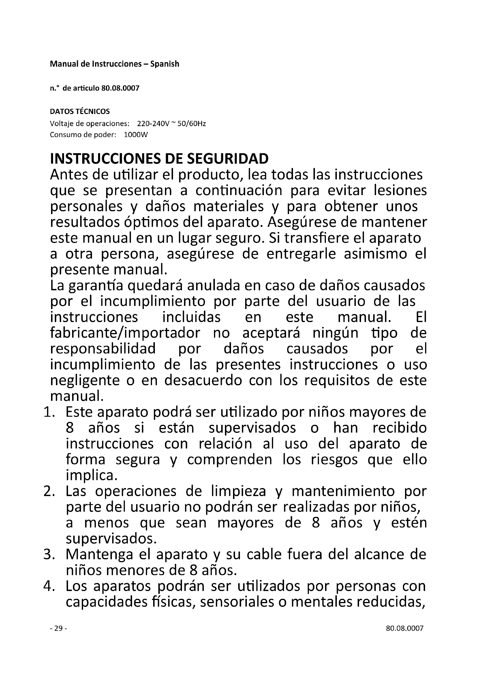 Antes de utilizar el producto, lea todas las instrucciones que se presentan a continuación para evitar lesiones personales y daños materiales y para obtener unos resultados óptimos del aparato. Asegúrese de mantener este manual en un lugar seguro. Si transfiere el aparato a otra persona, asegúrese de entregarle asimismo el presente manual. La garantía quedará anulada en caso de daños causados por el incumplimiento por parte del usuario de las instrucciones incluidas en este manual. El fabricante/importador no aceptará ningún tipo de responsabilidad por daños causados por el incumplimiento de las presentes instrucciones o uso negligente o en desacuerdo con los requisitos de este manual.
