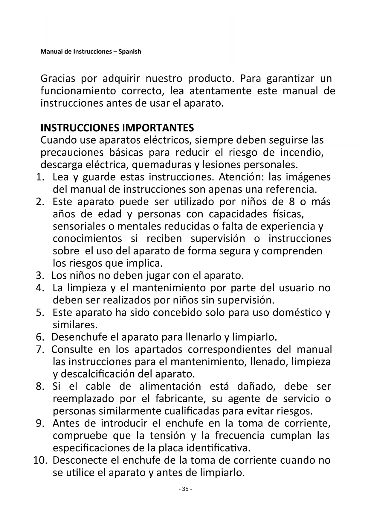 ——- 35 - Manual de Instrucciones – Spanish Gracias por adquirir nuestro producto. Para garantizar un funcionamiento correcto, lea atentamente este manual de instrucciones antes de usar el aparato. INSTRUCCIONES IMPORTANTES Cuando use aparatos eléctricos, siempre deben seguirse las precauciones básicas para reducir el riesgo de incendio, descarga eléctrica, quemaduras y lesiones personales.