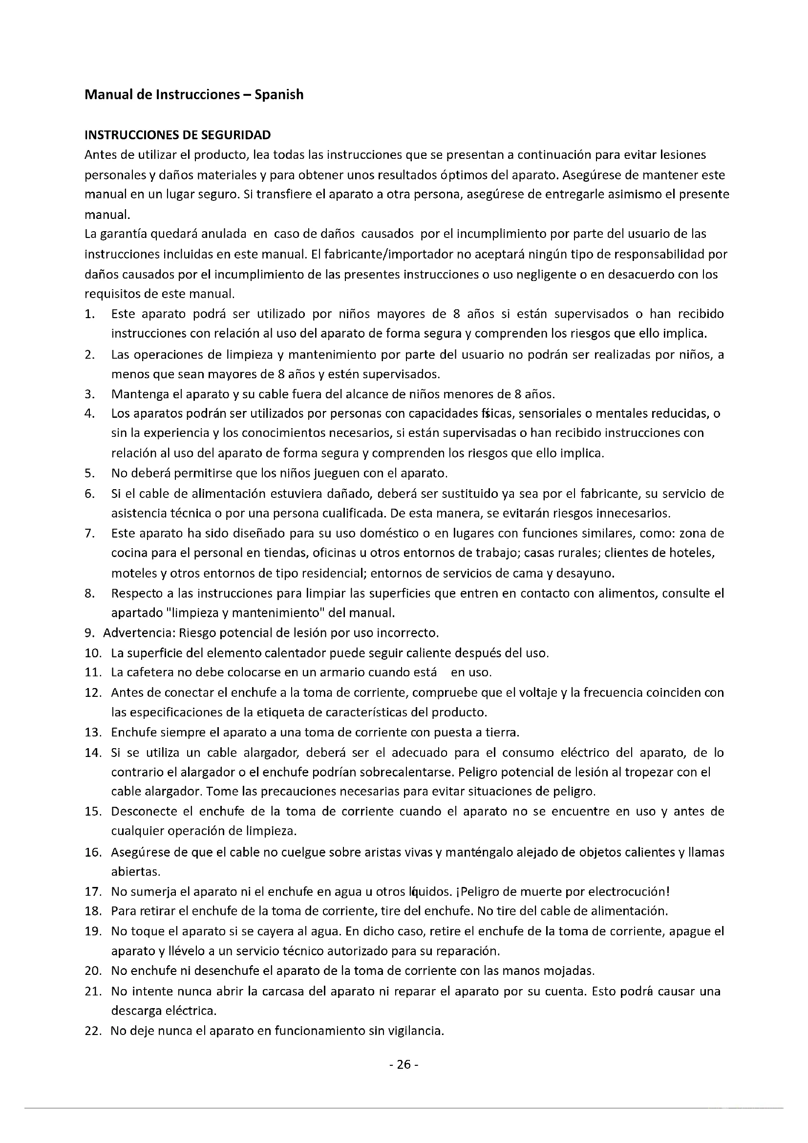 Antes de utilizar el producto, lea todas las instrucciones que se presentan a continuación para evitar lesiones personales y daños materiales y para obtener unos resultados óptimos del aparato. Asegúrese de mantener este manual en un lugar seguro. Si transfiere el aparato a otra persona, asegúrese de entregarle asimismo el presente manual. La garantía quedará anulada en caso de daños causados por el incumplimiento por parte del usuario de las instrucciones incluidas en este manual. El fabricante/importador no aceptará ningún tipo de responsabilidad por daños causados por el incumplimiento de las presentes instrucciones o uso negligente o en desacuerdo con los requisitos de este manual.