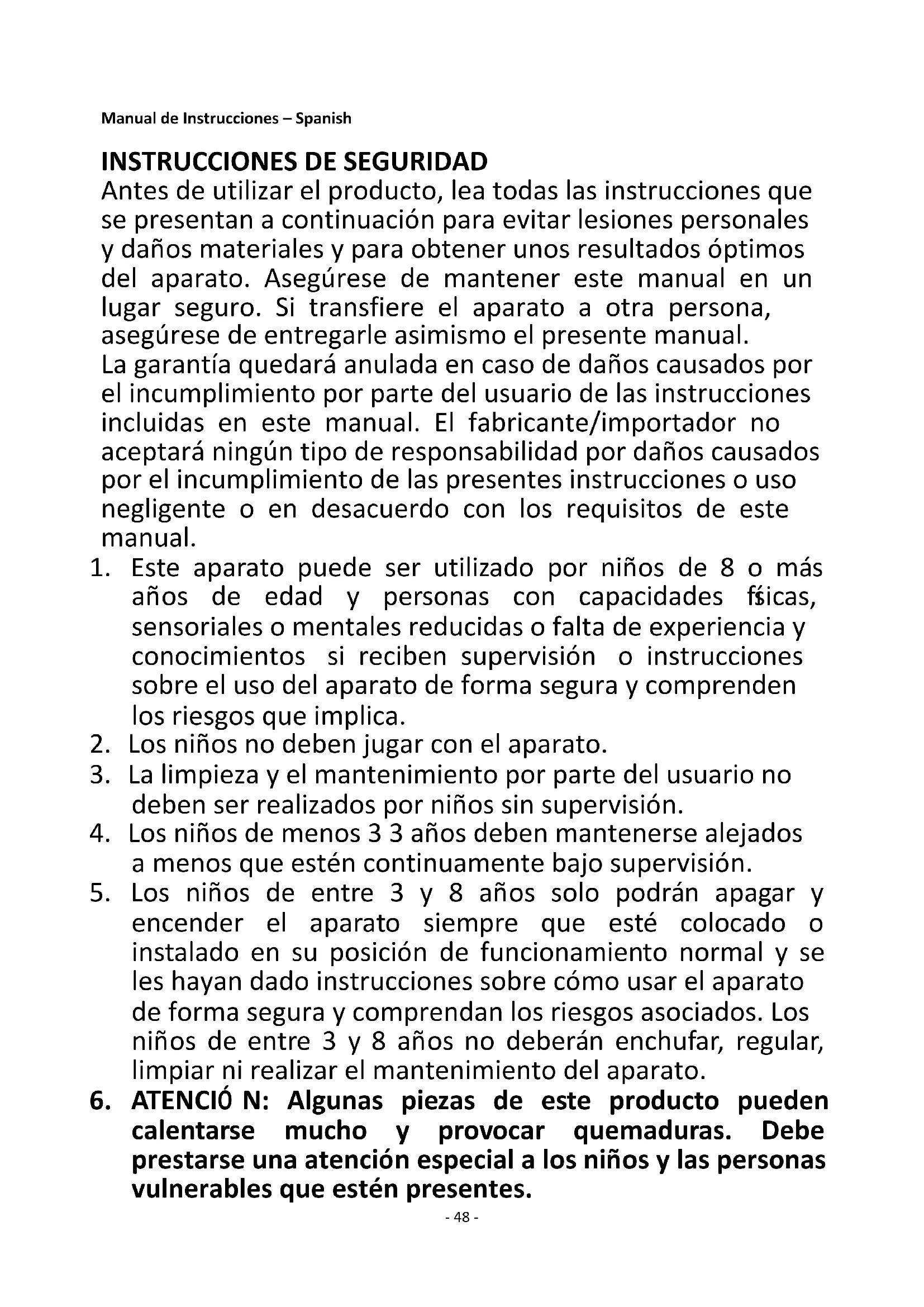 Antes de utilizar el producto, lea todas las instrucciones que se presentan a continuación para evitar lesiones personales y daños materiales y para obtener unos resultados óptimos del aparato. Asegúrese de mantener este manual en un lugar seguro. Si transfiere el aparato a otra persona, asegúrese de entregarle asimismo el presente manual. La garantía quedará anulada en caso de daños causados por el incumplimiento por parte del usuario de las instrucciones incluidas en este manual. El fabricante/importador no aceptará ningún tipo de responsabilidad por daños causados por el incumplimiento de las presentes instrucciones o uso negligente o en desacuerdo con los requisitos de este manual.