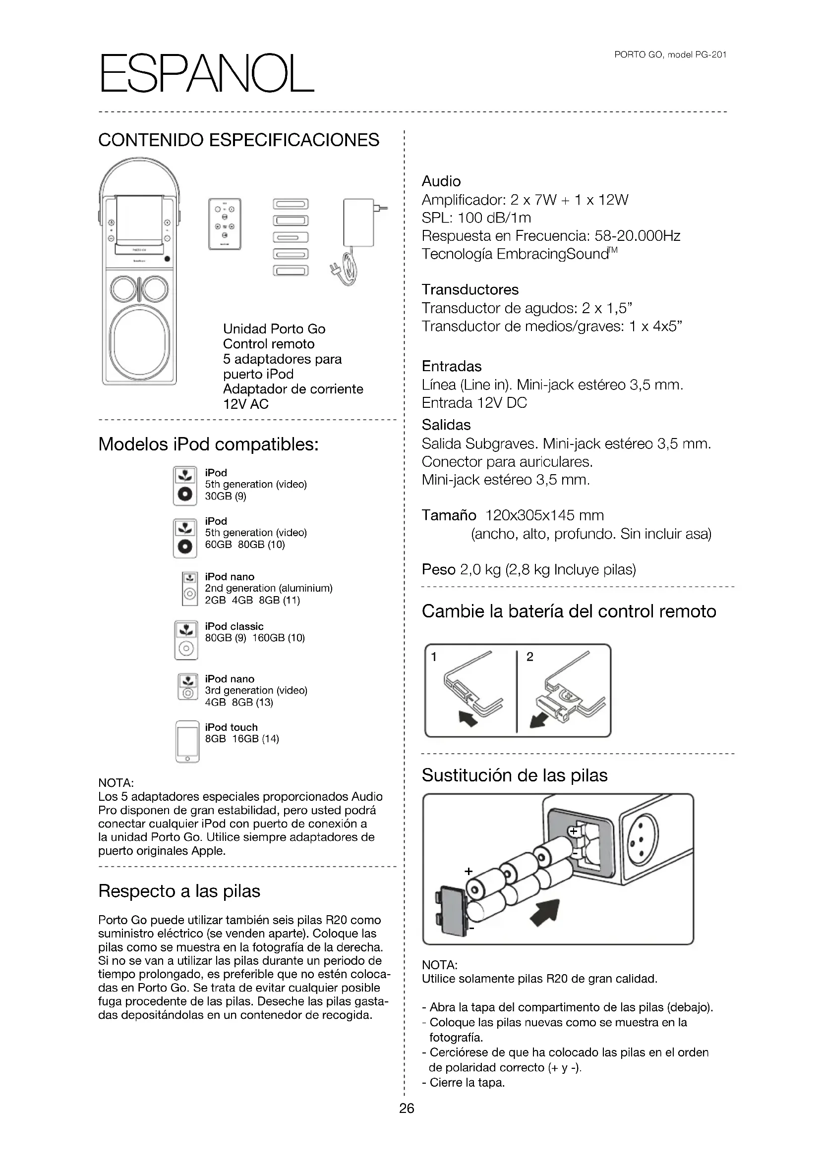 Il cavo CC (per il collegamento a 12V nell’auto) non è incluso. Rivolgersi al rivenditore locale autorizzato.ESP ANOL PORTO GO, model PG-201 Porto Go puede utilizar también seis pilas R20 como suministro eléctrico (se venden aparte). Coloque las pilas como se muestra en la fotografía de la derecha. Si no se van a utilizar las pilas durante un periodo de tiempo prolongado, es preferible que no estén coloca-das en Porto Go. Se trata de evitar cualquier posible fuga procedente de las pilas. Deseche las pilas gasta-das depositándolas en un contenedor de recogida. CONTENIDO ESPECIFICACIONES Unidad Porto Go Control remoto 5 adaptadores para puerto iPod Adaptador de corriente 12V AC Cambie la batería del control remoto Sustitución de las pilas NOTA:Utilice solamente pilas R20 de gran calidad.- Abra la tapa del compartimento de las pilas (debajo).- Coloque las pilas nuevas como se muestra en la fotografía.- Cerciórese de que ha colocado las pilas en el orden de polaridad correcto (+ y -).- Cierre la tapa.NOTA:Los 5 adaptadores especiales proporcionados Audio Pro disponen de gran estabilidad, pero usted podrá conectar cualquier iPod con puerto de conexión a la unidad Porto Go. Utilice siempre adaptadores de puerto originales Apple. Respecto a las pilas Modelos iPod compatibles: Audio Amplificador: 2 x 7W + 1 x 12W SPL: 100 dB/1m Respuesta en Frecuencia: 58-20.000Hz Tecnología EmbracingSound