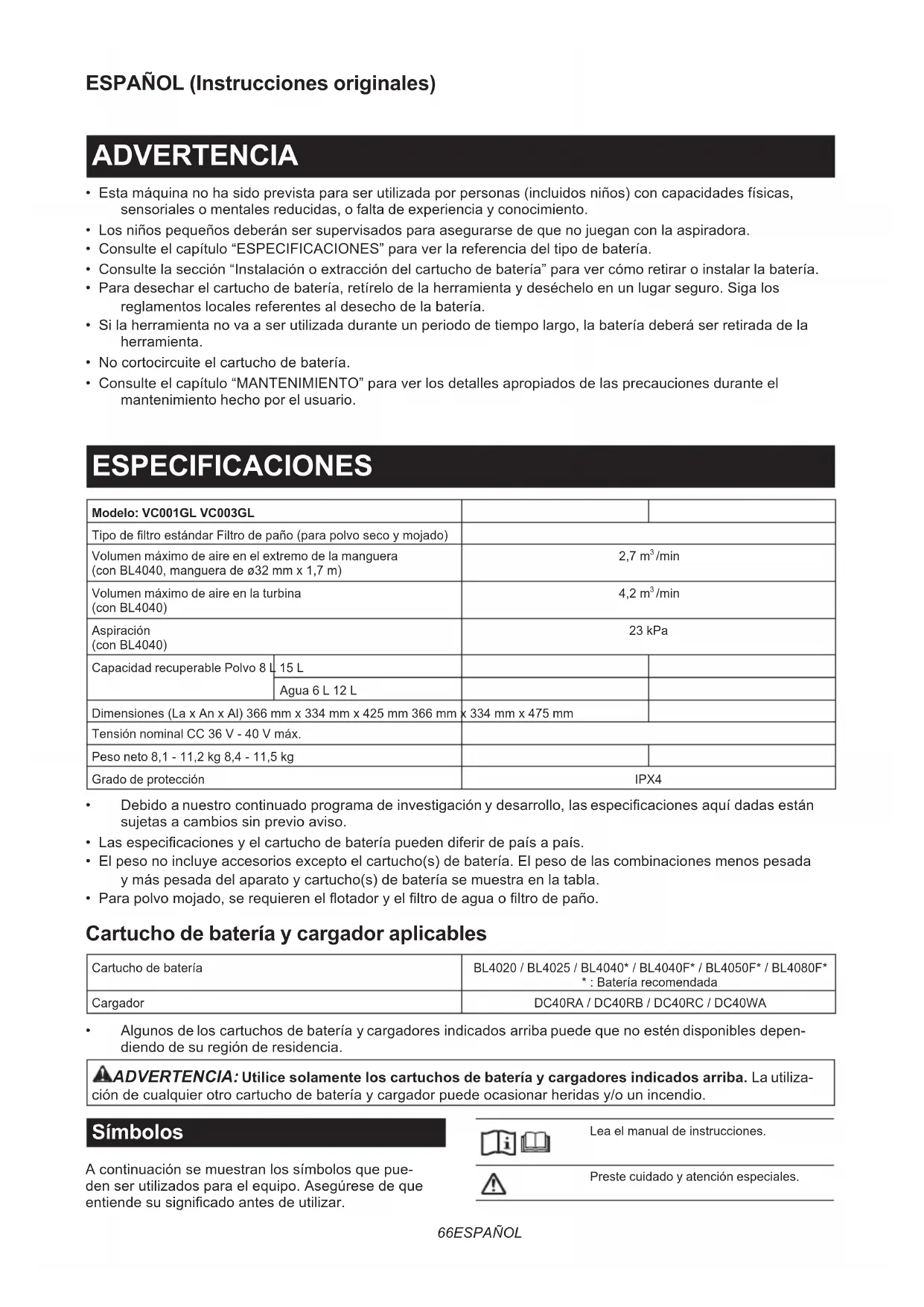 - Algunos de los cartuchos de batería y cargadores indicados arriba puede que no estén disponibles depen- diendo de su región de residencia. ADVERTENCIA: Utilice solamente los cartuchos de batería y cargadores indicados arriba. La utiliza- ción de cualquier otro cartucho de batería y cargador puede ocasionar heridas y/o un incendio. Símbolos A continuación se muestran los símbolos que pue- den ser utilizados para el equipo. Asegúrese de que entiende su signicado antes de utilizar. Lea el manual de instrucciones. Preste cuidado y atención especiales.67 ESPAÑOL ¡Advertencia! La aspiradora puede conte- ner polvo peligroso. No se ponga nunca encima de la aspiradora. Polvo de clase L (ligero). Las aspiradoras son capaces de recoger polvo de clase L. Siga los reglamentos de su país en relación con el polvo y la salud y seguridad laborales. Ni-MH Li-ion Sólo para países de la Unión Europea Debido a la presencia de componentes peligrosos en el equipo, el equipo eléctrico y electrónico, los acumuladores y las baterías desechados pueden tener un impacto negativo para el medioambiente y la salud humana. ¡No tire los aparatos eléctricos y electróni- cos ni las baterías junto con los residuos domésticos! De conformidad con las Directivas Europeas sobre residuos de aparatos eléctricos y electrónicos y sobre acumu- ladores y baterías y residuos de acumula- dores y baterías, así como la adaptación de las mismas a la ley nacional, el equipo eléctrico, las baterías y los acumuladores desechados deberán ser almacenados por separado y trasladados a un punto distinto de recogida de desechos municipales, que cumpla con los reglamentos sobre protec- ción medioambiental. Esto se indica mediante el símbolo de cubo de basura tachado colocado en el equipo. Uso previsto El aparato ha sido previsto para recoger tanto polvo seco como mojado. El aparato es apropiado para uso comercial, por ejemplo, en hoteles, escuelas, hospita- les, fábricas, tiendas, ocinas y negocios de alquiler. Ruido El nivel de ruido A-ponderado típico determinado de acuerdo con la norma EN60335-2-69: Modelo VC001GL Nivel de presión sonora (L