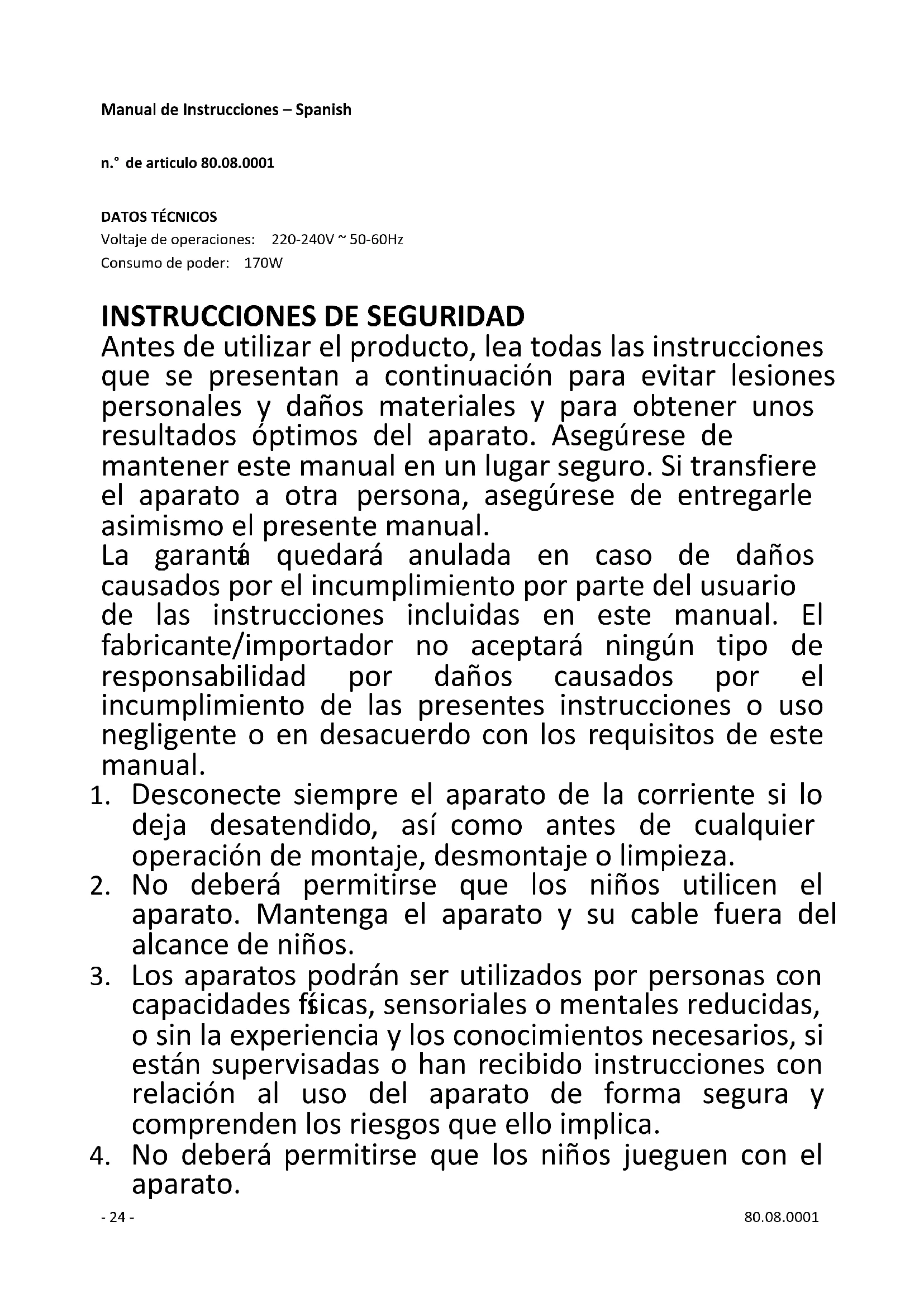 Antes de utilizar el producto, lea todas las instrucciones que se presentan a continuación para evitar lesiones personales y daños materiales y para obtener unos resultados óptimos del aparato. Asegúrese de mantener este manual en un lugar seguro. Si transfiere el aparato a otra persona, asegúrese de entregarle asimismo el presente manual. La garantía quedará anulada en caso de daños causados por el incumplimiento por parte del usuario de las instrucciones incluidas en este manual. El fabricante/importador no aceptará ningún tipo de responsabilidad por daños causados por el incumplimiento de las presentes instrucciones o uso negligente o en desacuerdo con los requisitos de este manual.