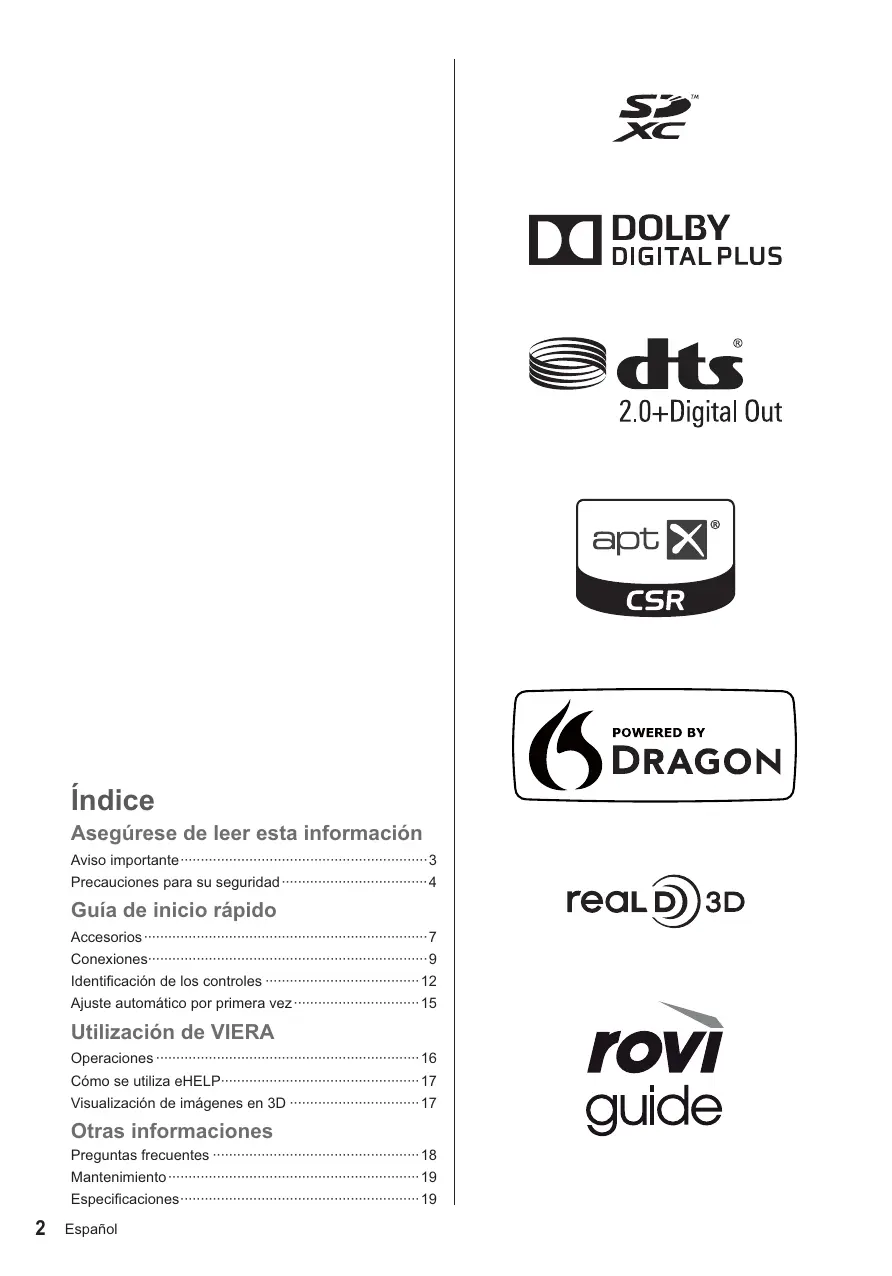 Español Aviso importante Aviso para las funciones DVB / emisión de datos / IPTV Para obtener información sobre las marcas registradas, consulte la [eHELP] (Soporte > Licencia). Este TV se ha diseñado para cumplir con los estándares (a partir de agosto de 2013) de servicios digitales terrestres DVB-T / T2 (MPEG2 y MPEG4AVC(H.264)) y servicios digitales de cable DVB-C (MPEG2 y MPEG4-AVC(H.264)). Con respecto a la disponibilidad de servicios DVB-T / T2 en su área, consulte a su proveedor local. Con respecto a la disponibilidad de servicios DVB-C para este televisor, consulte a su proveedor de servicios de cable. Este televisor puede no funcionar correctamente con una señal que no cumpla con los estándares DVB-T / T2 o DVB-C. No todas las funciones estarán disponibles dependiendo del país, el área, el difusor, el proveedor del servicio y el entorno de red. No todos los módulos CI trabajan adecuadamente con este televisor. Consulte al proveedor del servicio en relación con el módulo CI disponible. Este televisor puede no funcionar correctamente con un módulo CI no aprobado por el proveedor del servicio. Dependiendo del proveedor del servicio es posible que haya que abonar tarifas adicionales. La compatibilidad con futuros servicios no está garantizada. Compruebe la información más reciente sobre los servicios disponibles en el sitio web siguiente. (Inglés solamente) http://panasonic.net/viera/support Panasonic no garantiza el funcionamiento ni el rendimiento de dispositivos periféricos de otros fabricantes, y rechazamos cualquier responsabilidad o daño que pueda surgir del funcionamiento y rendimiento utilizando dichos dispositivos periféricos de otro fabricante. La grabación y la reproducción de contenidos en este o en cualquier otro dispositivo pueden requerir permiso del propietario de los derechos de autor u otro tipo de autorización. Panasonic no tiene autoridad ni puede garantizar dicho permiso y rechaza expresamente cualquier derecho, capacidad o intención de obtenerlo en nombre de usted. Usted es el responsable de asegurarse de que este o cualquier otro dispositivo se utilicen de acuerdo con la legislación nacional sobre los derechos de autor. Para obtener más información sobre las leyes y los reglamentos pertinentes, consulte la legislación nacional de su país o póngase en contacto con el propietario de los derechos de autor del contenido que desea grabar o reproducir. Español
