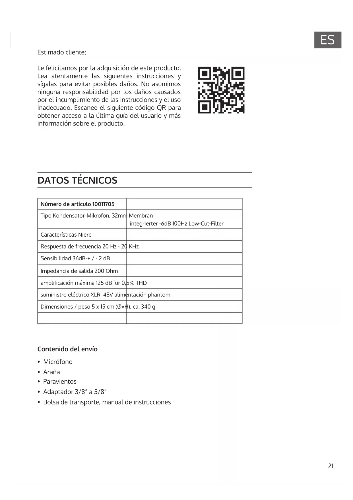 Número de artículo 10011705 Tipo Kondensator-Mikrofon, 32mm Membran integrierter -6dB 100Hz Low-Cut-Filter Características Niere Respuesta de frecuencia 20 Hz - 20 KHz Sensibilidad 36dB-+ / - 2 dB Impedancia de salida 200 Ohm amplicación máxima 125 dB für 0,5% THD suministro eléctrico XLR, 48V alimentación phantom Dimensiones / peso 5 x 15 cm (ØxH), ca. 340g Contenido del envío
