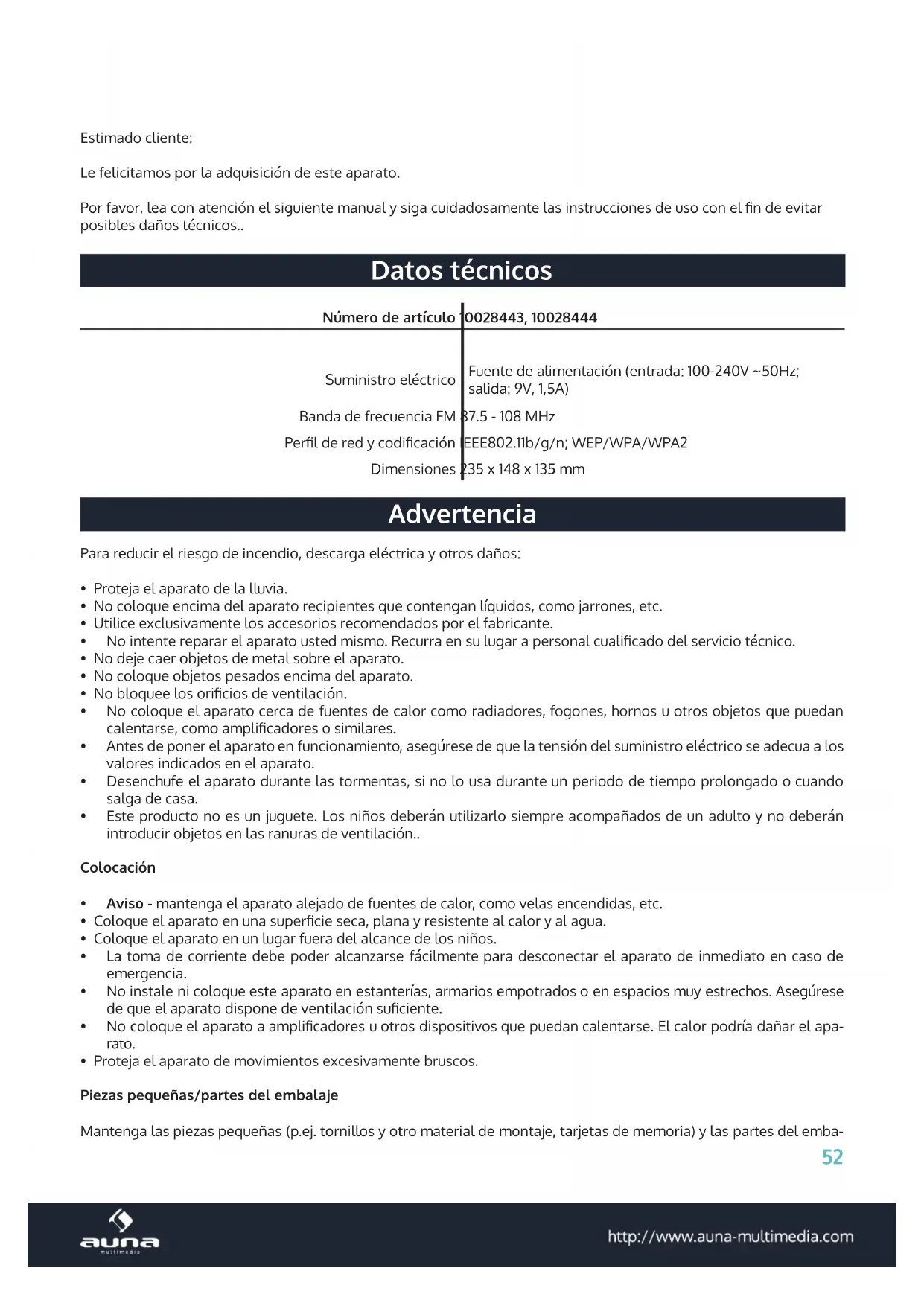 Déclaration de conformité Fabricant : Chal-Tec GmbH, Wallstraße 16, 10179 Berlin, Allemagne Ce produit est conforme aux directives européennes suivantes : 2014/30/UE (CEM) 2011/65/UE (RoHS)52 Estimado cliente: Le felicitamos por la adquisición de este aparato. Por favor, lea con atención el siguiente manual y siga cuidadosamente las instrucciones de uso con el n de evitar posibles daños técnicos.. Datos técnicos Número de artículo 10028443, 10028444 Suministro eléctrico Fuente de alimentación (entrada: 100-240V ~50Hz; salida: 9V, 1,5A) Banda de frecuencia FM 87.5 - 108 MHz Perl de red y codicación IEEE802.11b/g/n; WEP/WPA/WPA2 Dimensiones 235 x 148 x 135 mm Advertencia Para reducir el riesgo de incendio, descarga eléctrica y otros daños: