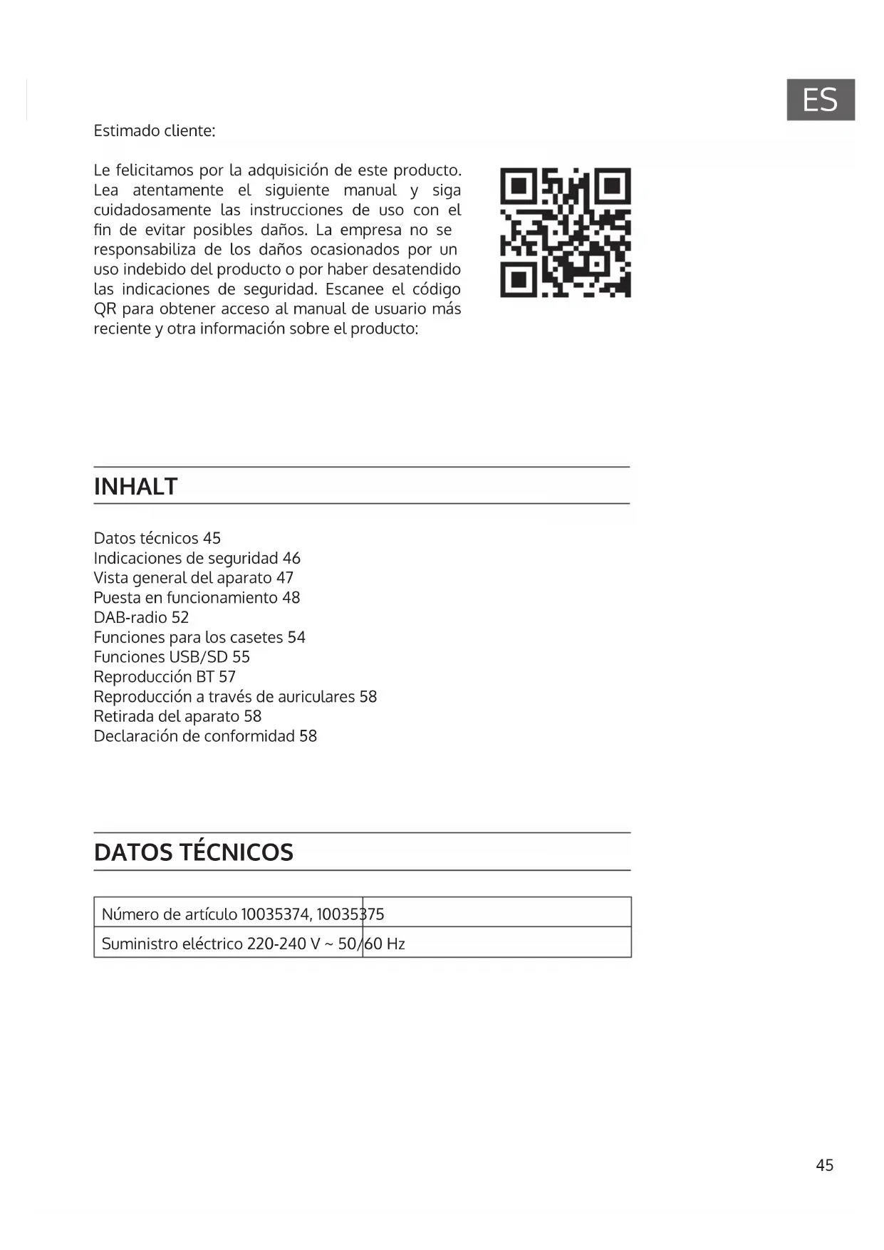 Número de artículo 10035374, 10035375 Suministro eléctrico 220-240 V ~ 50/60 Hz INHALT Datos técnicos 45 Indicaciones de seguridad 46 Vista general del aparato 47 Puesta en funcionamiento 48 DAB-radio 52 Funciones para los casetes 54 Funciones USB/SD 55 Reproducción BT 57 Reproducción a través de auriculares 58 Retirada del aparato 58 Declaración de conformidad 5846