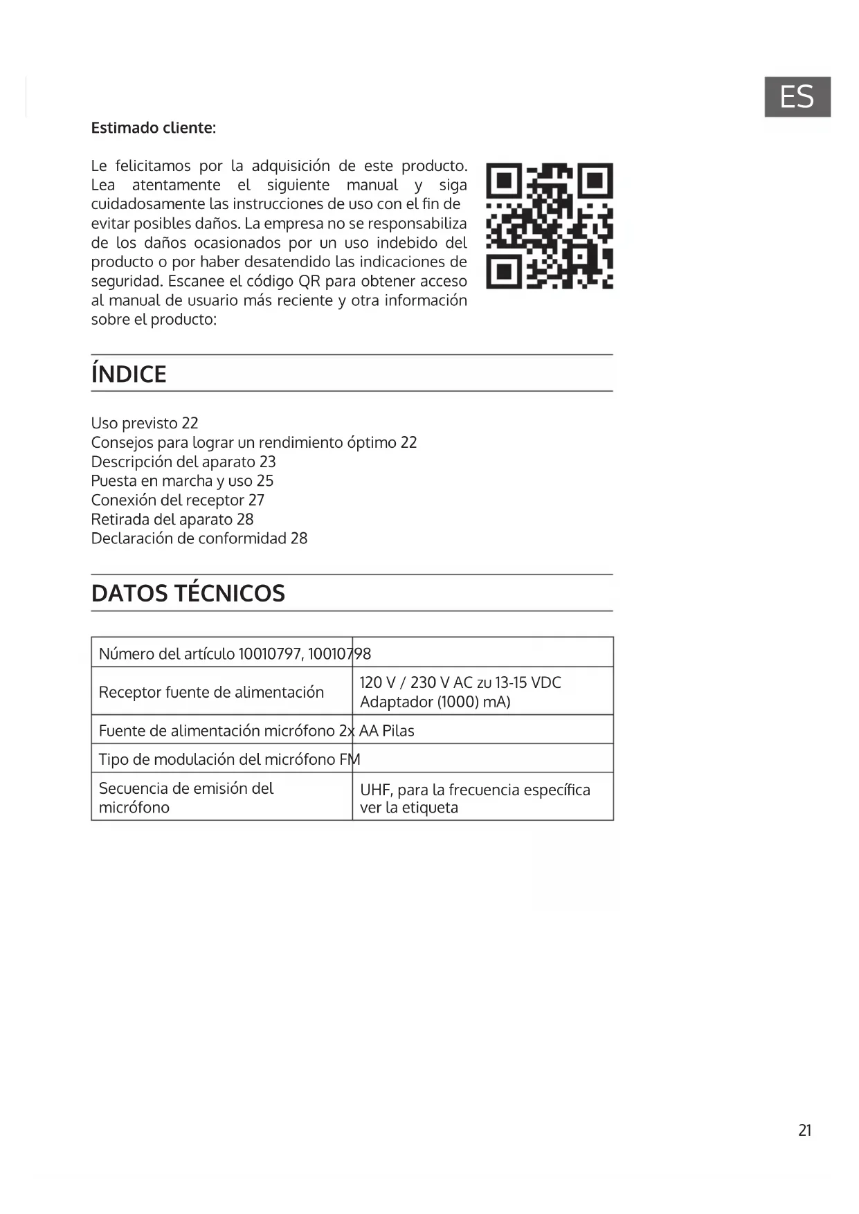 Estimado cliente: Le felicitamos por la adquisición de este producto. Lea atentamente el siguiente manual y siga cuidadosamente las instrucciones de uso con el n de evitar posibles daños. La empresa no se responsabiliza de los daños ocasionados por un uso indebido del producto o por haber desatendido las indicaciones de seguridad. Escanee el código QR para obtener acceso al manual de usuario más reciente y otra información sobre el producto: ÍNDICE Uso previsto 22 Consejos para lograr un rendimiento óptimo 22 Descripción del aparato 23 Puesta en marcha y uso 25 Conexión del receptor 27 Retirada del aparato 28 Declaración de conformidad 28