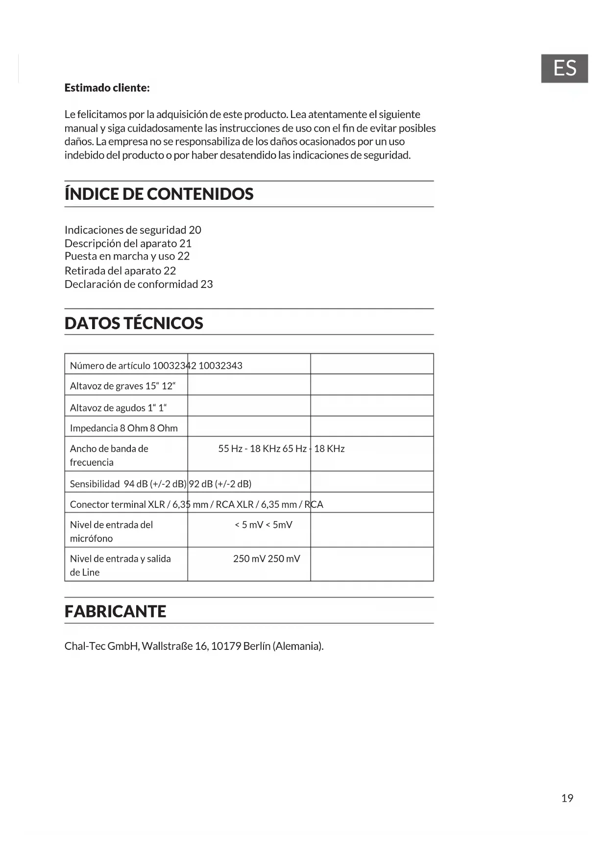 1 Monitor LCD 2 Manejo MP3 MODE: Conversor USB/ST/BT/FM Reproducción Repetir pista /repetir todas las pistas / reproducción aleatoria FOL: FOL: Pulse este botón durante más de 5 segundos para acceder al modo carpeta (pulse los botones o para seleccionar la carpeta anterior/siguiente. /VOL-: pista anterior; pulse este botón durante más de 2 segundos para bajar el volumen. Mantenga presionado el botón para silenciar el altavoz. /VOL+: pista siguiente; pulse este botón durante más de 2 segundos para subir el volumen. Mantenga pulsado el botón para aumentar el volumen al máximo (nivel 25). 3 Entrada de tarjeta SD 4 Entrada USB 5 Regulador principal de volumen 6 Regulador de agudos para frecuencias altas 7 Regulador de graves para frecuencias bajas 8 Regulador de nivel de entrada del micrófono 9 Regulador de nivel de entrada de la toma Line 10 Entrada del micrófono 6,35 mm 11 Salida de Línea (Dcha. + Izda.) 12 Entrada Line 3,5 mm 13 Entradas Line (Dcha. + Izqda.) 14 Indicador CLIP LED 15 Indicador LED de encendido 16 Salida del altavoz 8 Ohmios 17 Toma del enchufe asegurada 18 Interruptor 230 V 19 Interruptor principal22