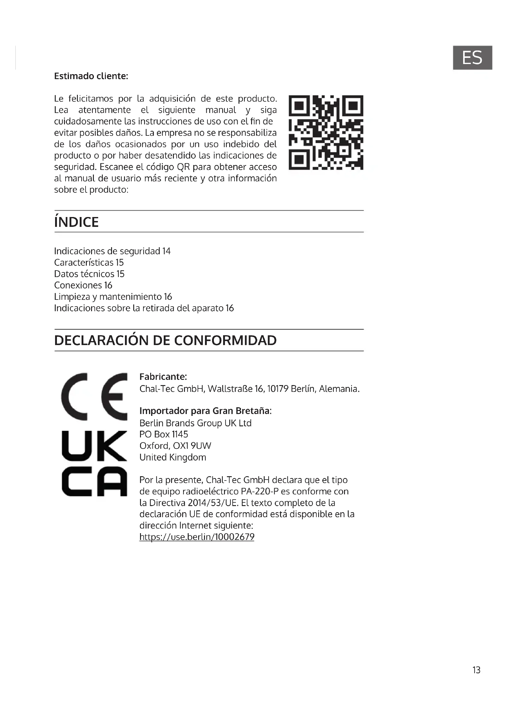 Fabricante: Chal-Tec GmbH, Wallstraße 16, 10179 Berlín, Alemania. Importador para Gran Bretaña: Berlin Brands Group UK Ltd PO Box 1145 Oxford, OX1 9UW United Kingdom Por la presente, Chal-Tec GmbH declara que el tipo de equipo radioeléctrico PA-220-P es conforme con la Directiva 2014/53/UE. El texto completo de la declaración UE de conformidad está disponible en la dirección Internet siguiente: https://use.berlin/1000267914